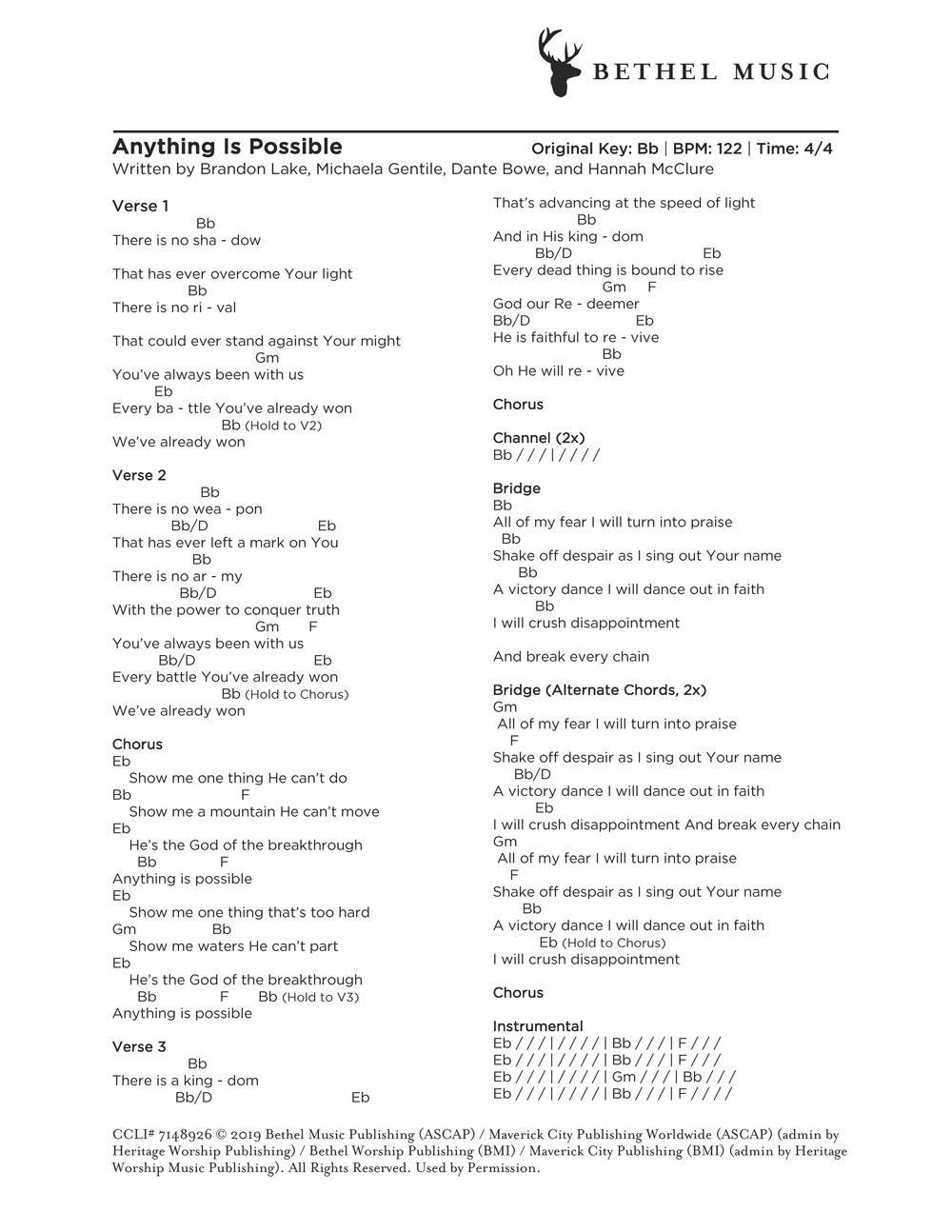 © 2019 Bethel Music Publishing (ASCAP) / Maverick City Publishing Worldwide (ASCAP) (admin by Heritage Worship Publishing) / Brandon Lake Music (ASCAP) (admin by Bethel Music Publishing) / Bethel Worship Publishing (BMI) / Maverick City Publishing (BMI) (admin by Heritage Worship Music Publishing). All Rights Reserved. Used by Permission.