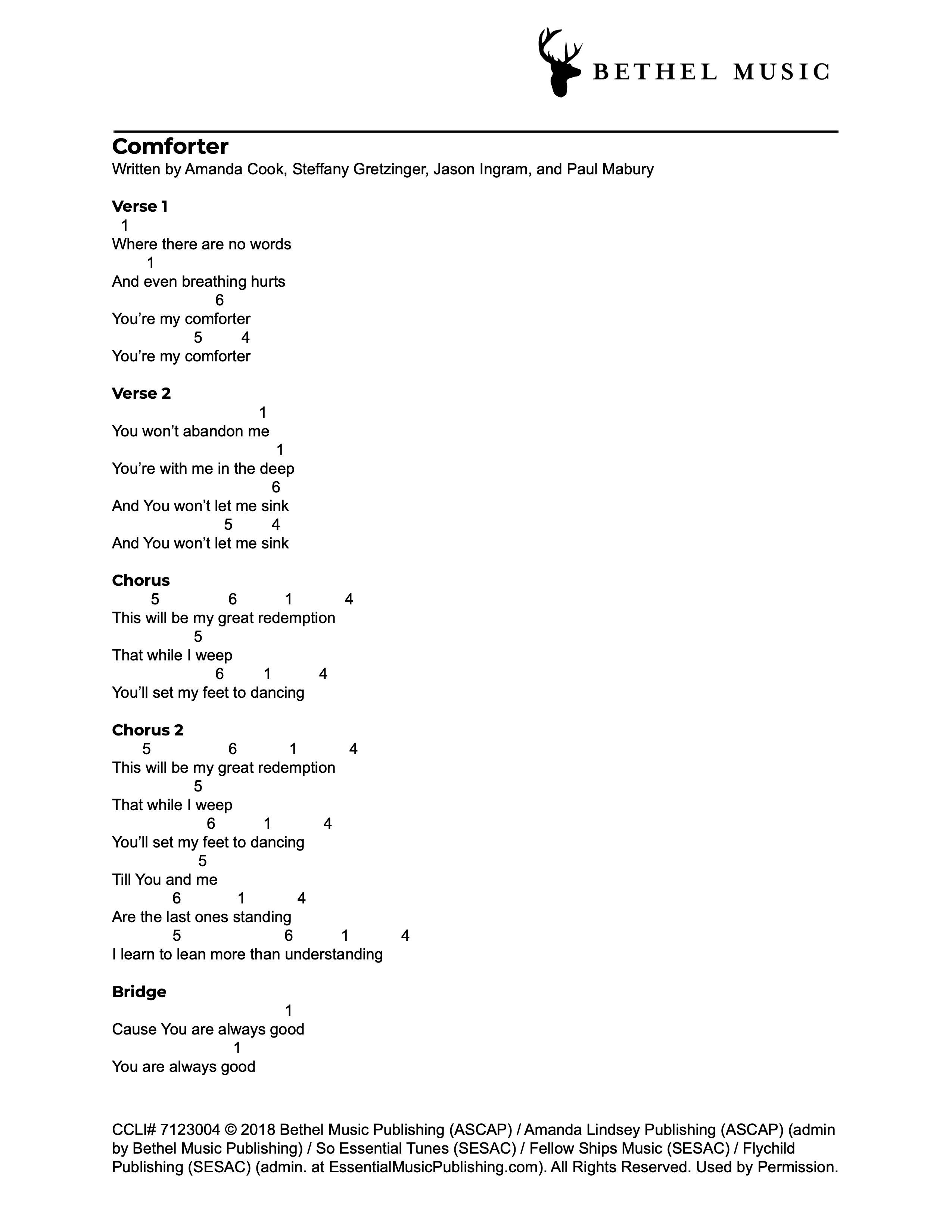 © 2018 Bethel Music Publishing (ASCAP) / Amanda Lindsey Publishing (ASCAP) (admin by Bethel Music Publishing) / So Essential Tunes (SESAC) / Fellow Ships Music (SESAC) / Flychild Publishing (SESAC) (admin. at EssentialMusicPublishing.com). All Rights Reserved. Used by Permission.
