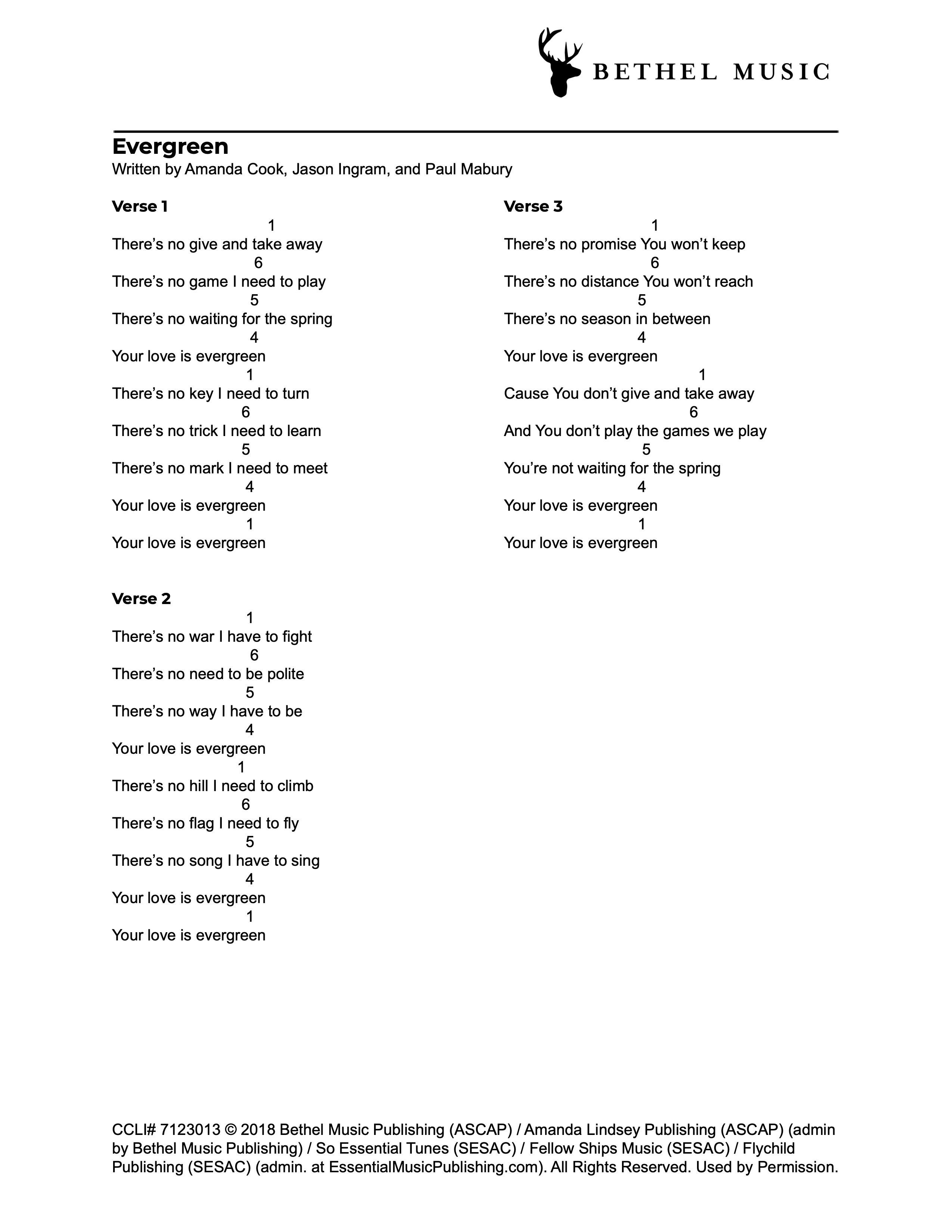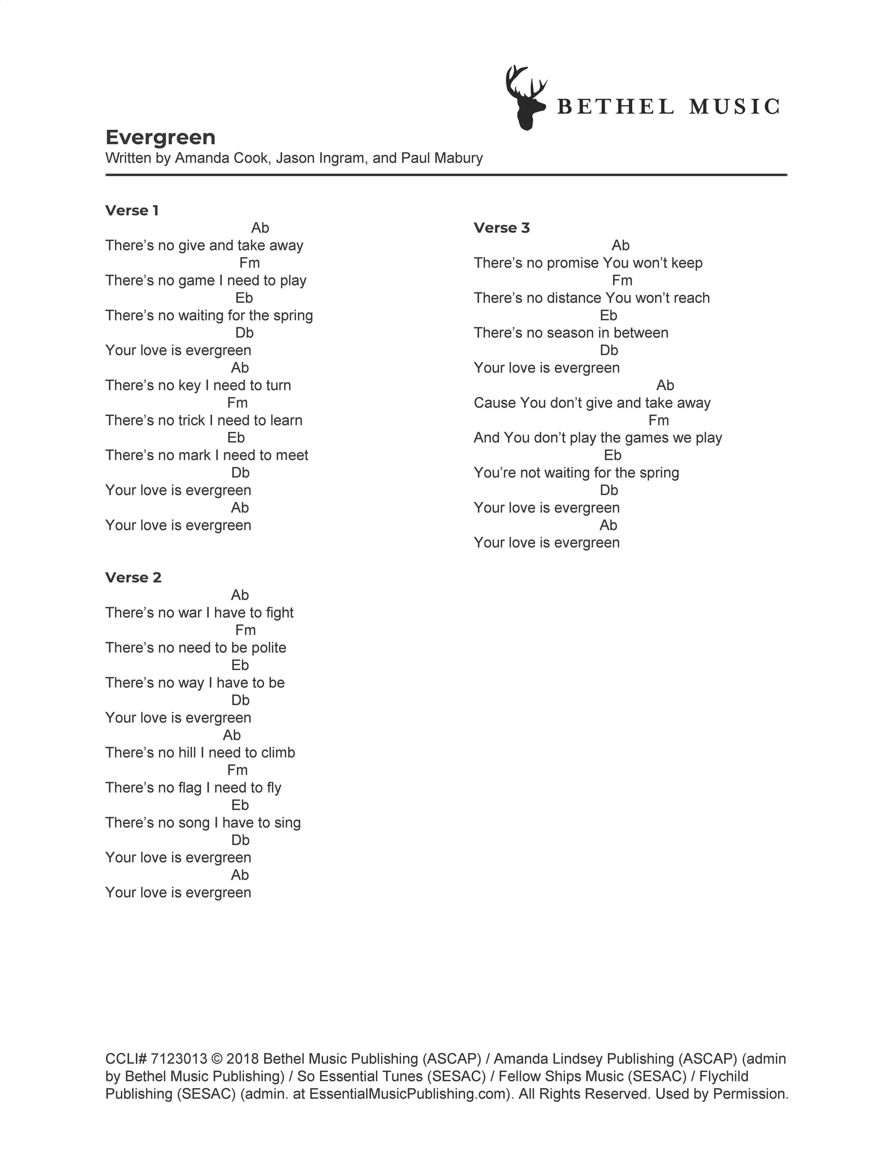 © 2018 Bethel Music Publishing (ASCAP) / Amanda Lindsey Publishing (ASCAP) (admin by Bethel Music Publishing) / So Essential Tunes (SESAC) / Fellow Ships Music (SESAC) / Flychild Publishing (SESAC) (admin. at EssentialMusicPublishing.com). All Rights Reserved. Used by Permission.