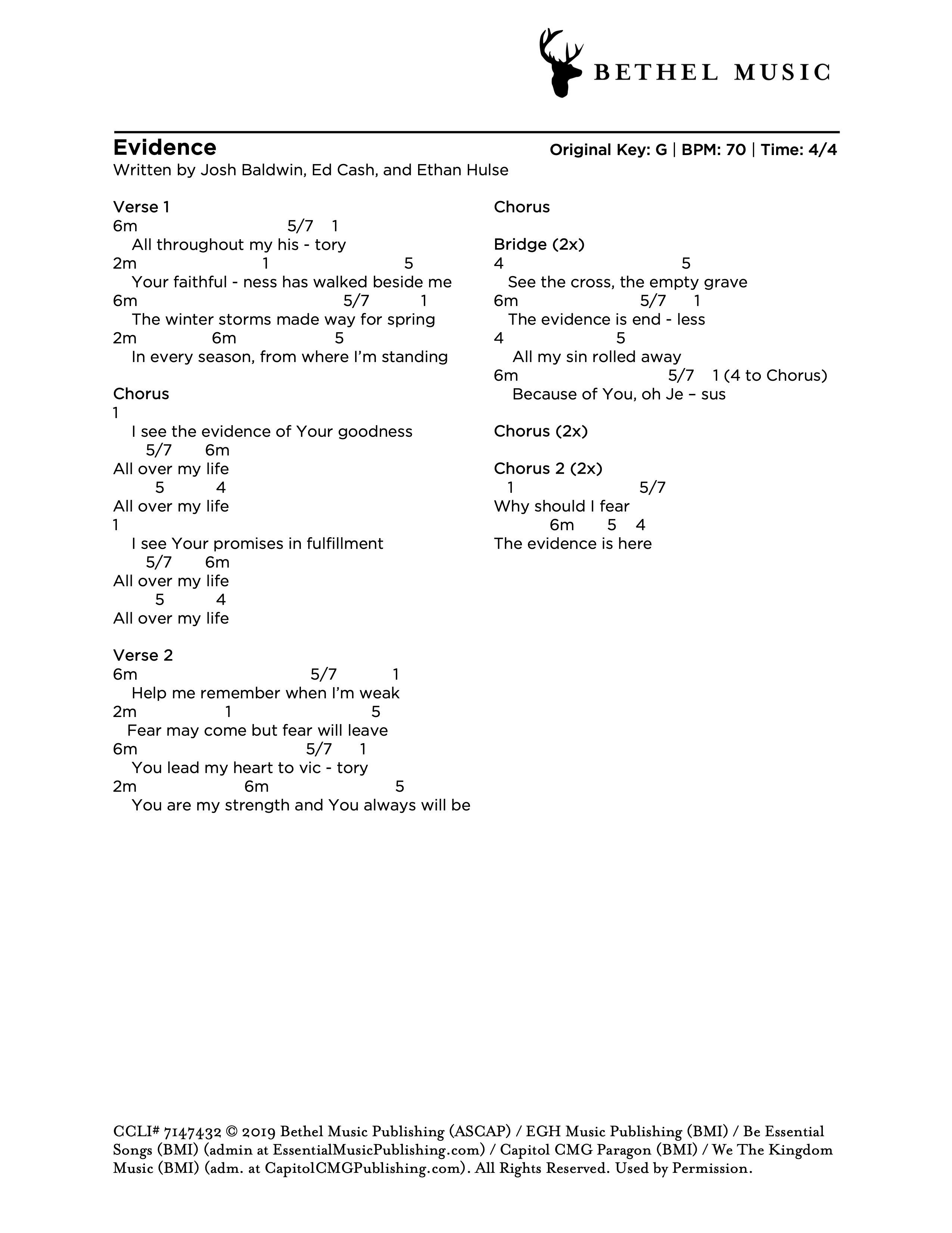 © 2019 Bethel Music Publishing (ASCAP) / EGH Music Publishing (BMI) / Be Essential Songs (BMI) (admin at EssentialMusicPublishing.com) / Capitol CMG Paragon (BMI) / We The Kingdom Music (BMI) (adm. at CapitolCMGPublishing.com). All Rights Reserved. Used by Permission.