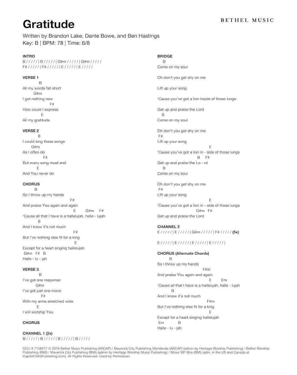 © 2019 Bethel Music Publishing (ASCAP) / Maverick City Publishing Worldwide (ASCAP) (admin by Heritage Worship Publishing) / Brandon Lake Music (ASCAP) (admin by Bethel Music Publishing) / Bethel Worship Publishing (BMI) / Maverick City Publishing (BMI) (admin by Heritage Worship Music Publishing) / Shout MP Brio (BMI) (adm. in the US and Canada at CapitolCMGPublishing.com). All Rights Reserved. Used by Permission.