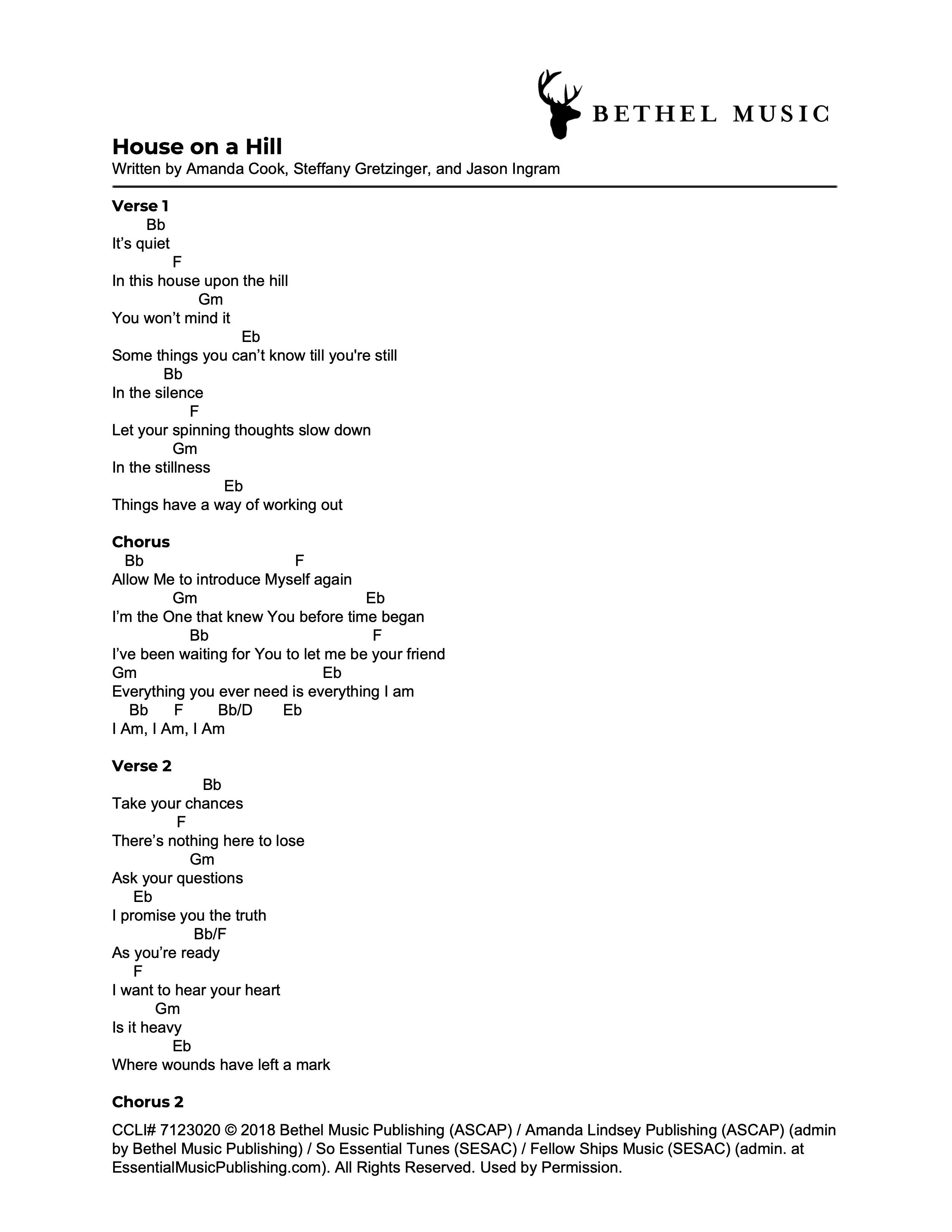 © 2018 Bethel Music Publishing (ASCAP) / Amanda Lindsey Publishing (ASCAP) (admin by Bethel Music Publishing) / So Essential Tunes (SESAC) / Fellow Ships Music (SESAC) (admin. at EssentialMusicPublishing.com). All Rights Reserved. Used by Permission.