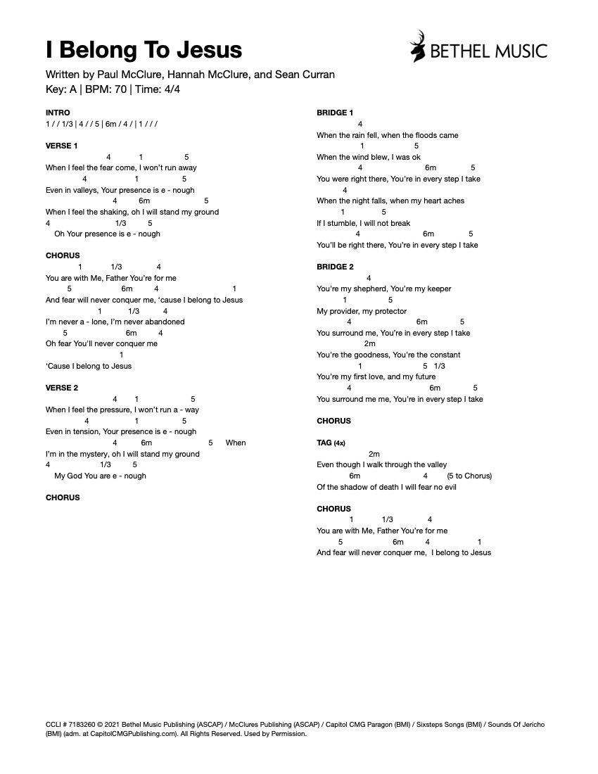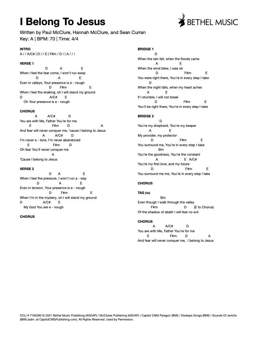© 2021 Bethel Music Publishing (ASCAP) / McClures Publishing (ASCAP) (admin by Bethel Music Publishing) / Capitol CMG Paragon (BMI) / Sixsteps Songs (BMI) / Sounds Of Jericho (BMI) (adm. at CapitolCMGPublishing.com). All Rights Reserved. Used by Permission.
