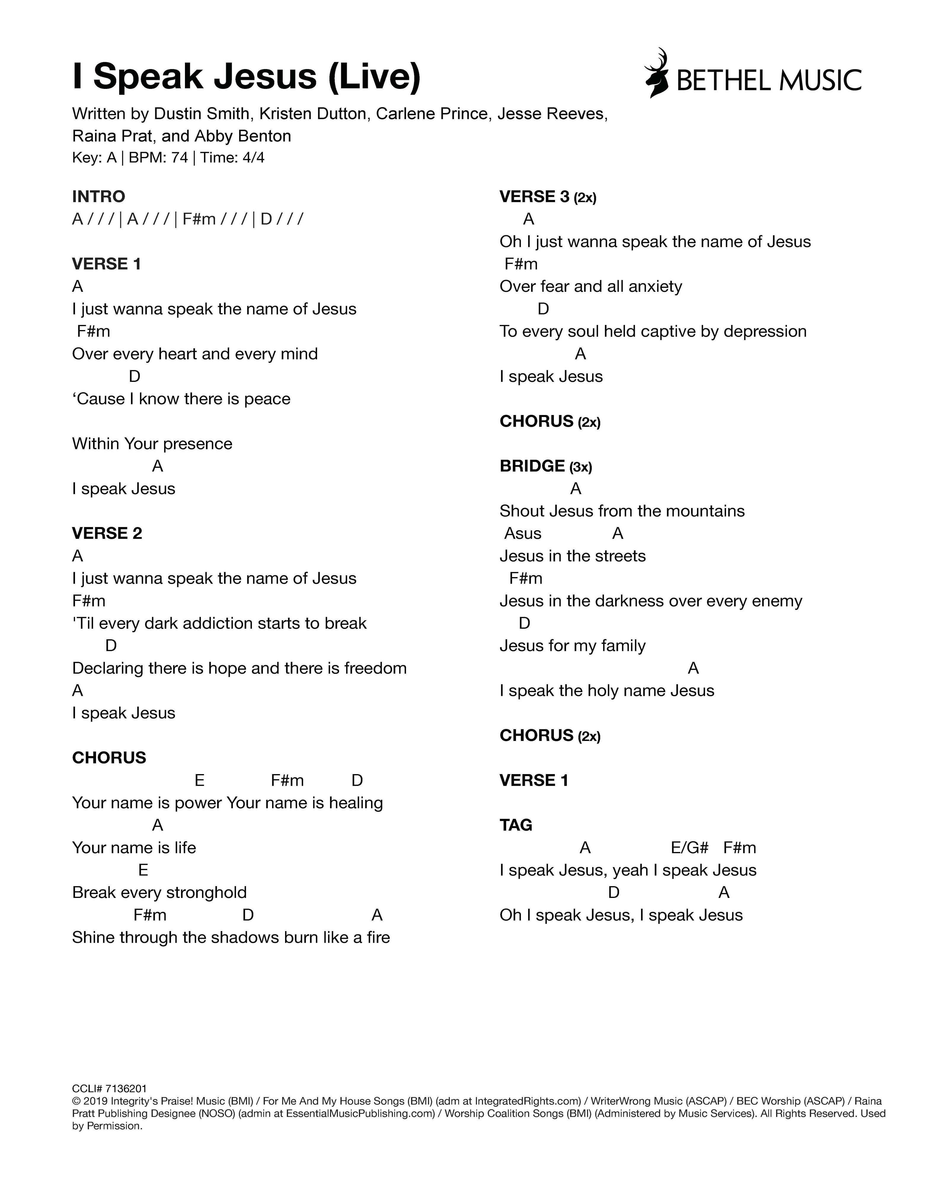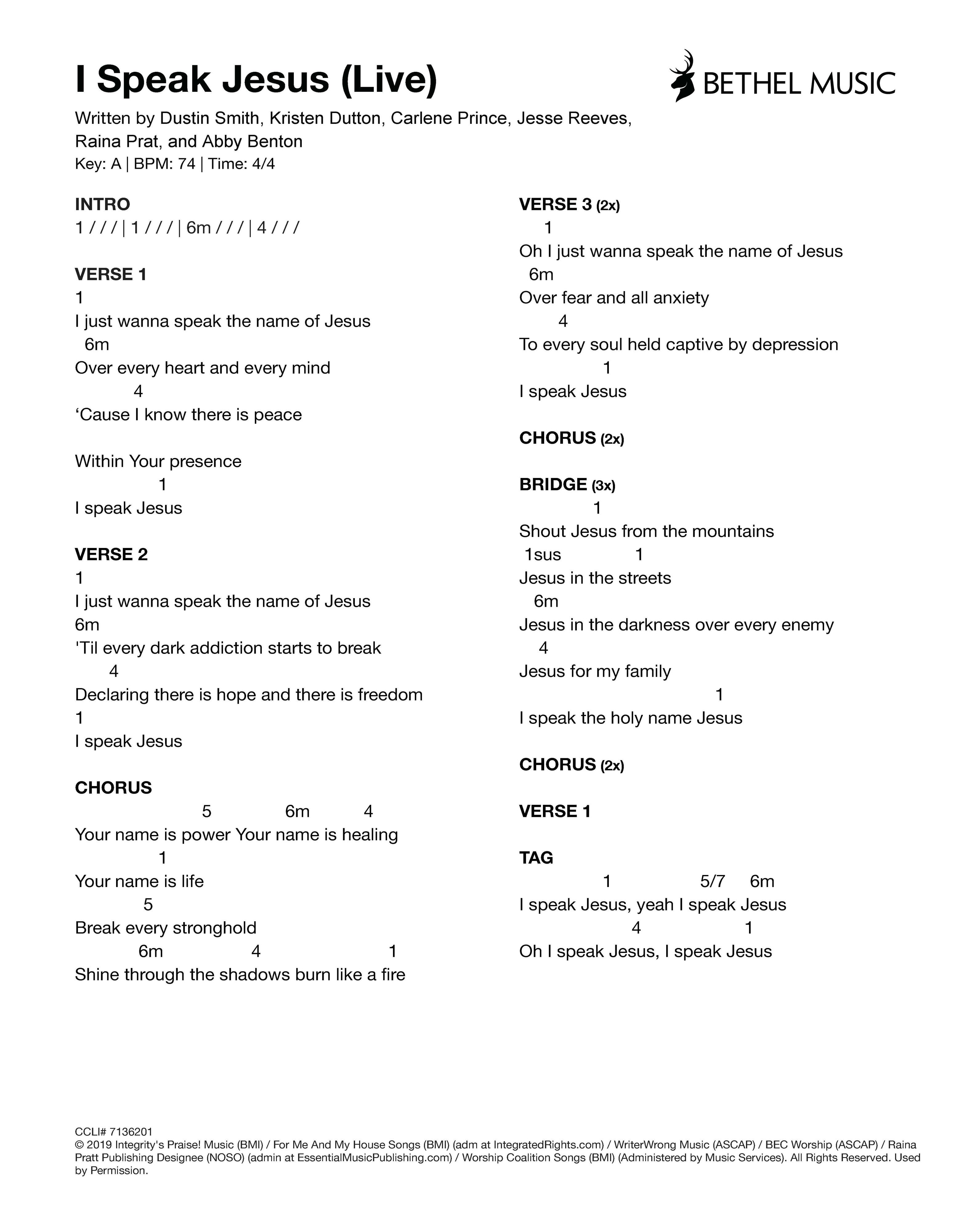 © 2019 Integrity's Praise! Music (BMI) / For Me And My House Songs (BMI) (adm at IntegratedRights.com) / WriterWrong Music (ASCAP) / BEC Worship (ASCAP) / Raina Pratt Publishing Designee (NOSO) (admin at EssentialMusicPublishing.com) / Worship Coalition Songs (BMI) (Administered by Music Services). All Rights Reserved. Used by Permission.