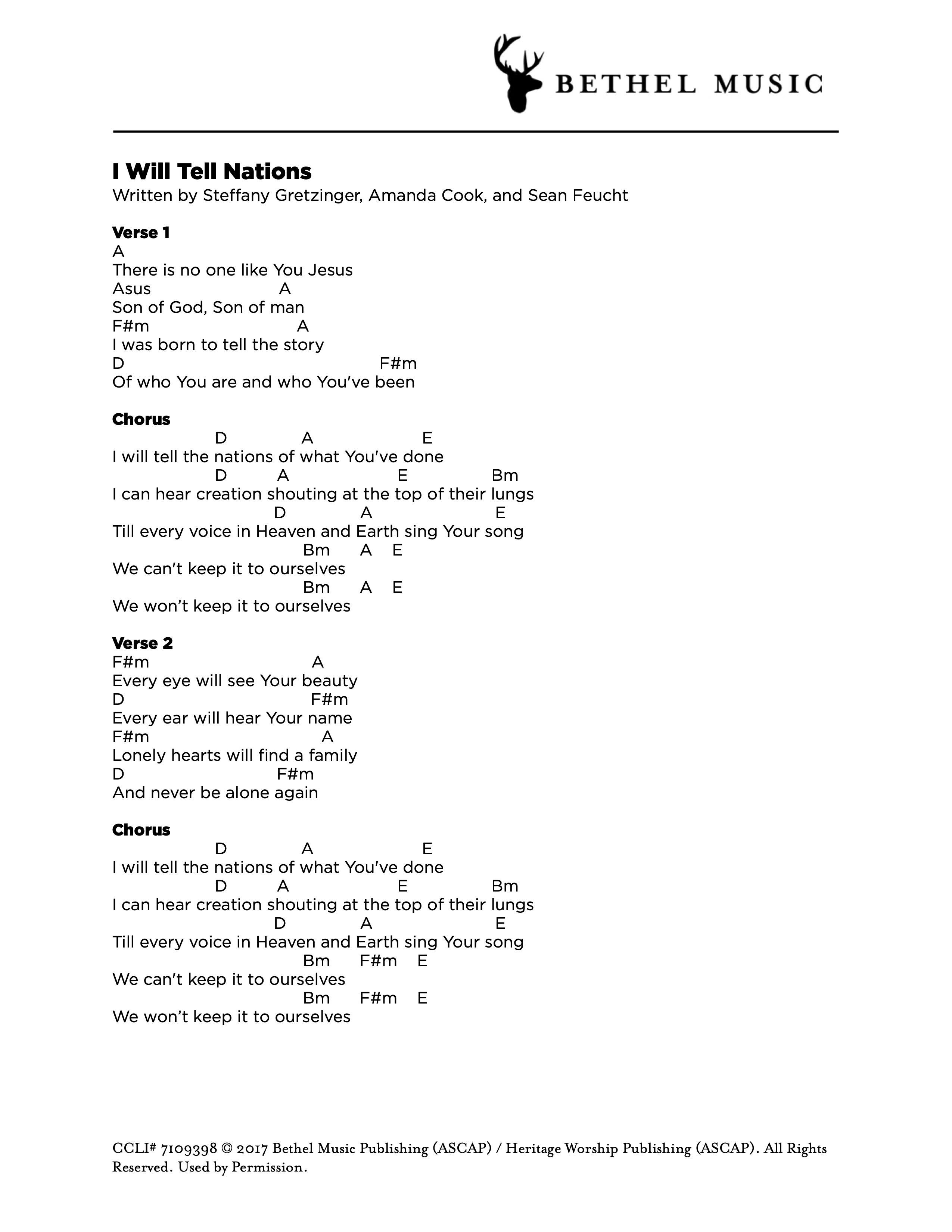 © 2017 Bethel Music Publishing (ASCAP) / Heritage Worship Publishing (ASCAP). All Rights Reserved. Used by Permission.