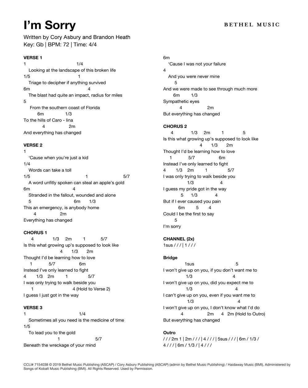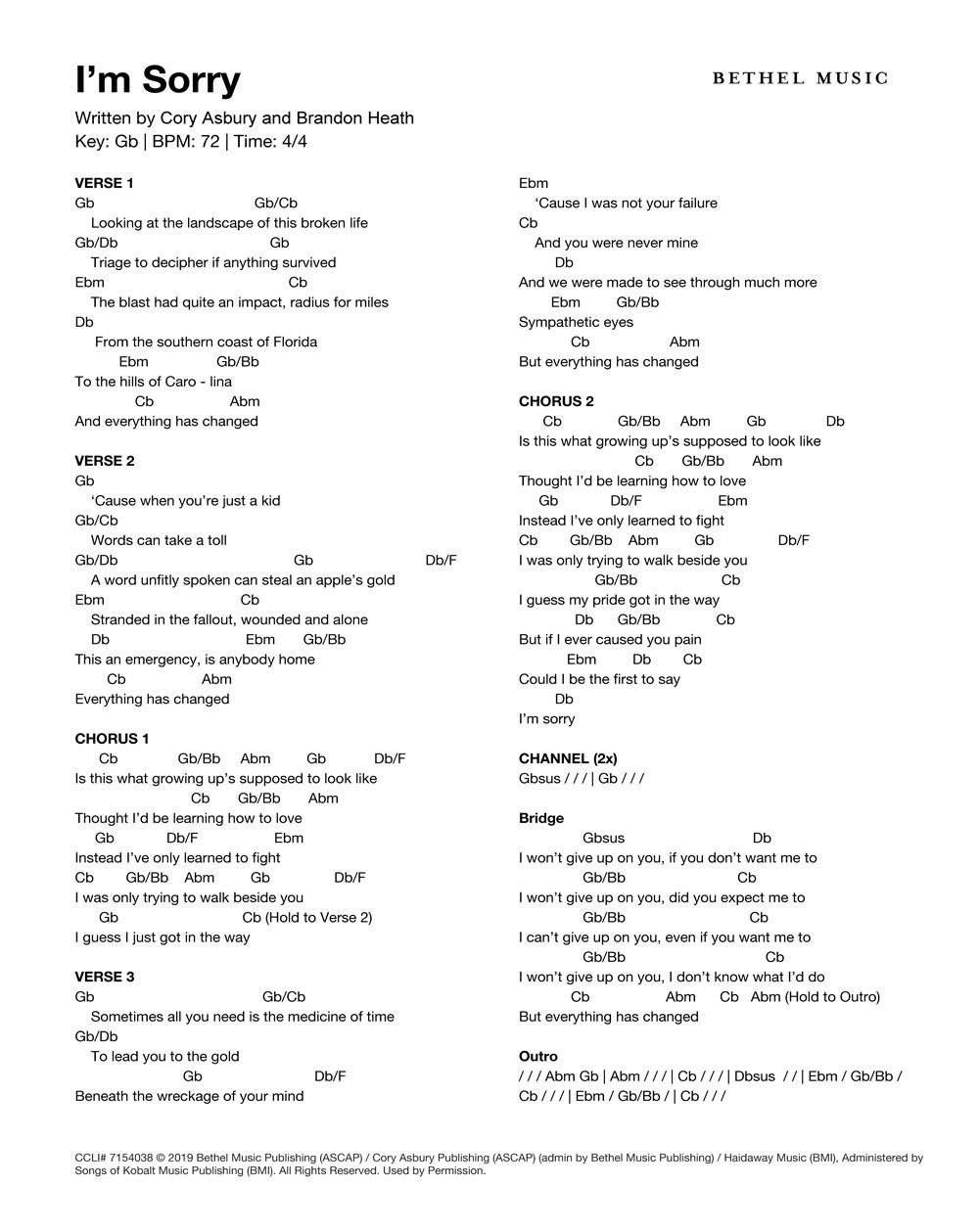© 2019 Bethel Music Publishing (ASCAP) / Cory Asbury Publishing (ASCAP) (admin by Bethel Music Publishing) / Haidaway Music (BMI), Administered by Songs of Kobalt Music Publishing (BMI). All Rights Reserved. Used by Permission.