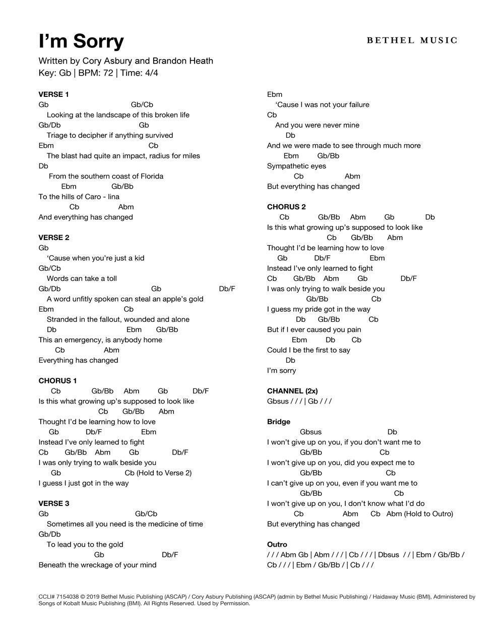 © 2019 Bethel Music Publishing (ASCAP) / Cory Asbury Publishing (ASCAP) (admin by Bethel Music Publishing) / Haidaway Music (BMI), Administered by Songs of Kobalt Music Publishing (BMI). All Rights Reserved. Used by Permission.