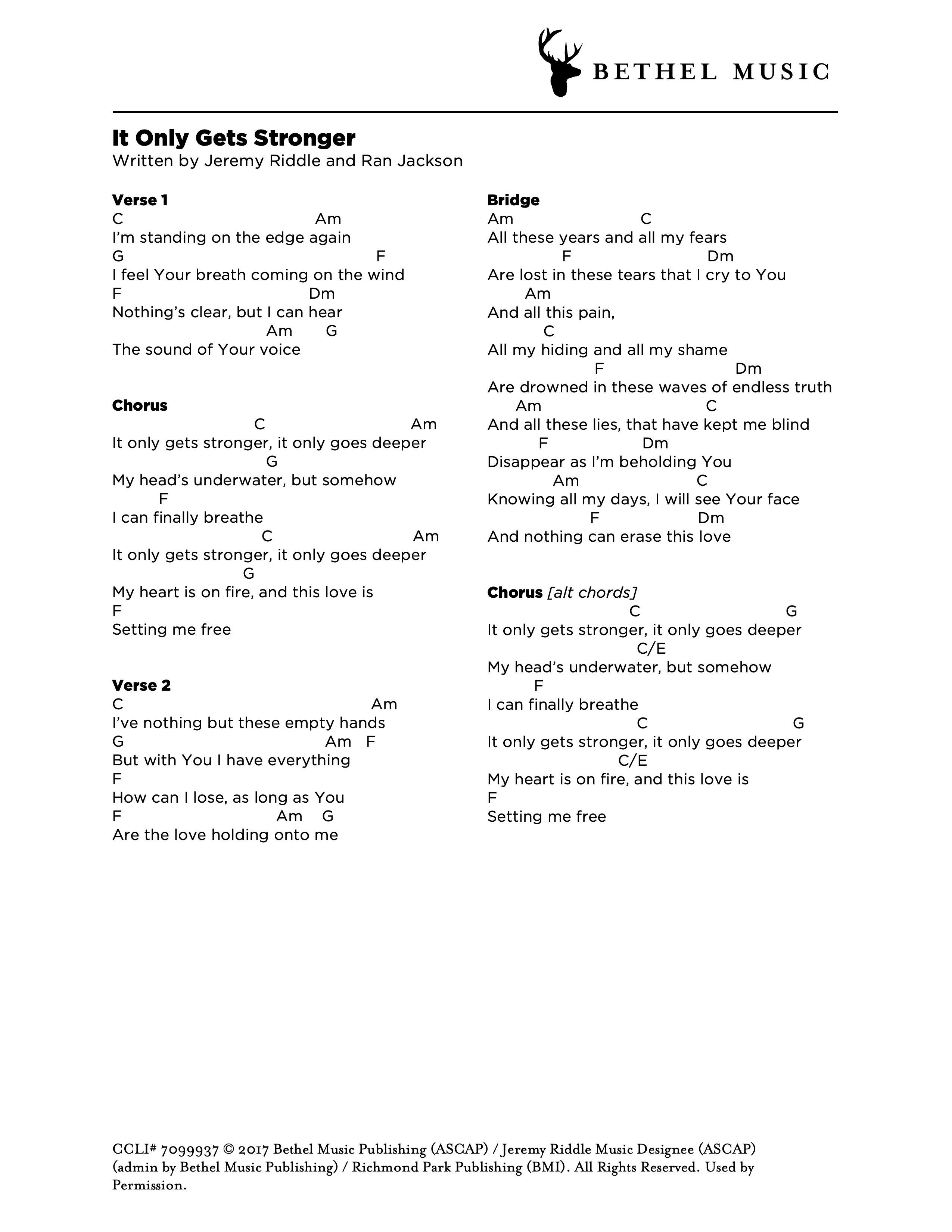 © 2017 Bethel Music Publishing (ASCAP) / Jeremy Riddle Music Designee (ASCAP) (admin by Bethel Music Publishing) / Richmond Park Publishing (BMI) (admin. at EssentialMusicPublishing.com). All Rights Reserved. Used by Permission.
