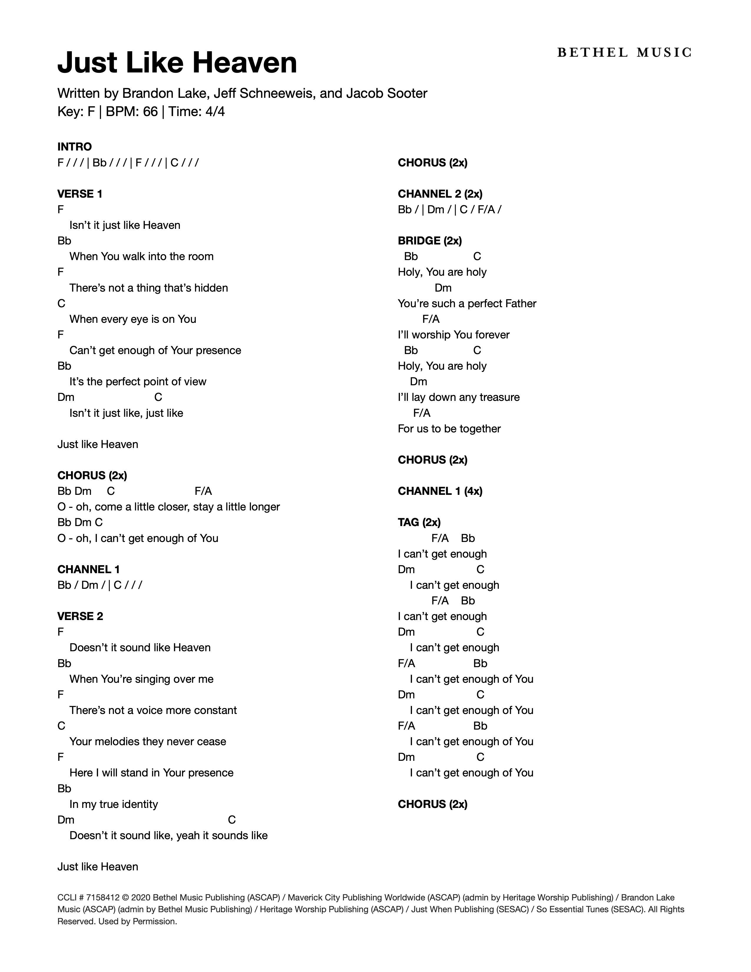 © 2020 Bethel Music Publishing (ASCAP) / Maverick City Publishing Worldwide (ASCAP) (admin by Heritage Worship Publishing) / Brandon Lake Music (ASCAP) (admin by Bethel Music Publishing) / Heritage Worship Publishing (ASCAP) / Just When Publishing (SESAC) / So Essential Tunes (SESAC) (admin. at EssentialMusicPublishing.com). All Rights Reserved. Used by Permission.