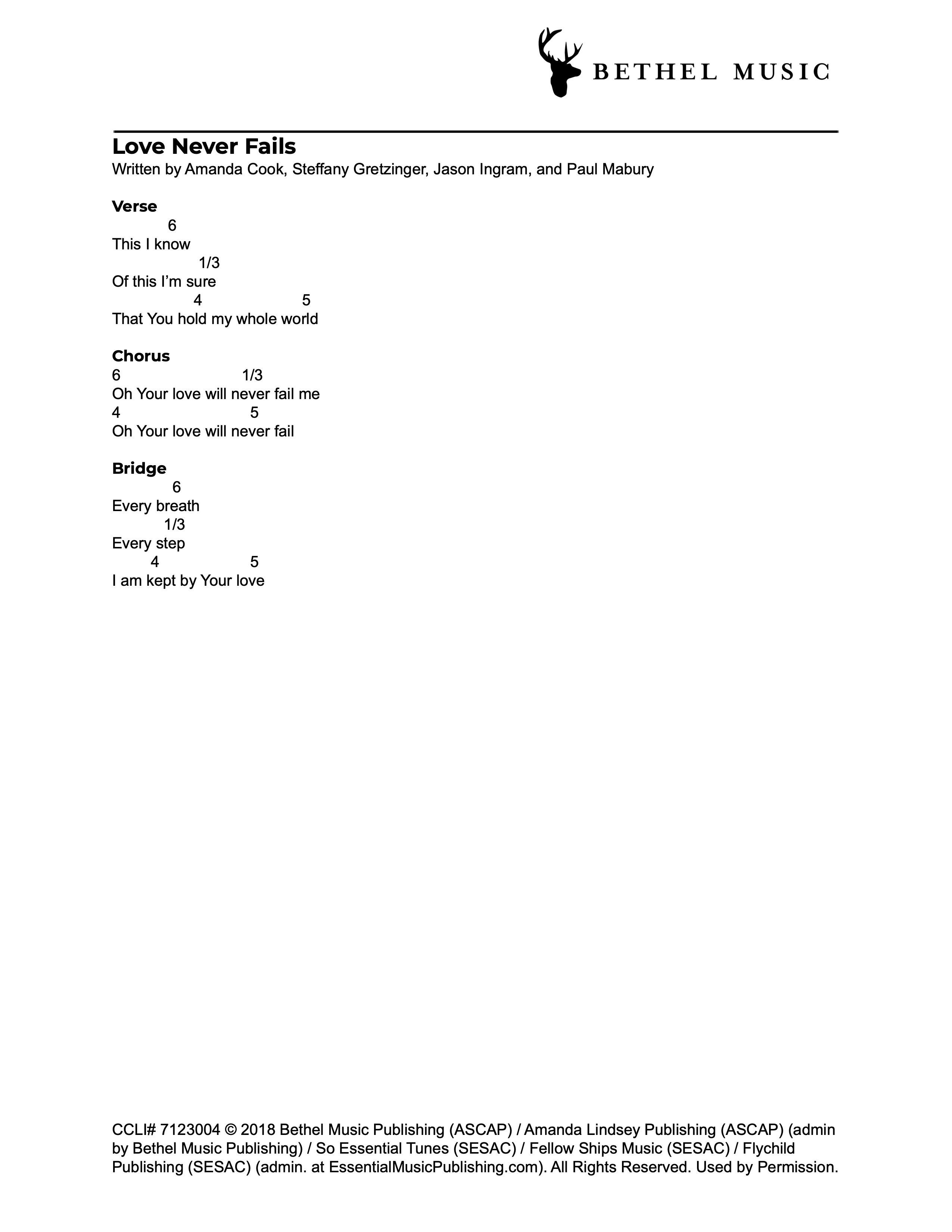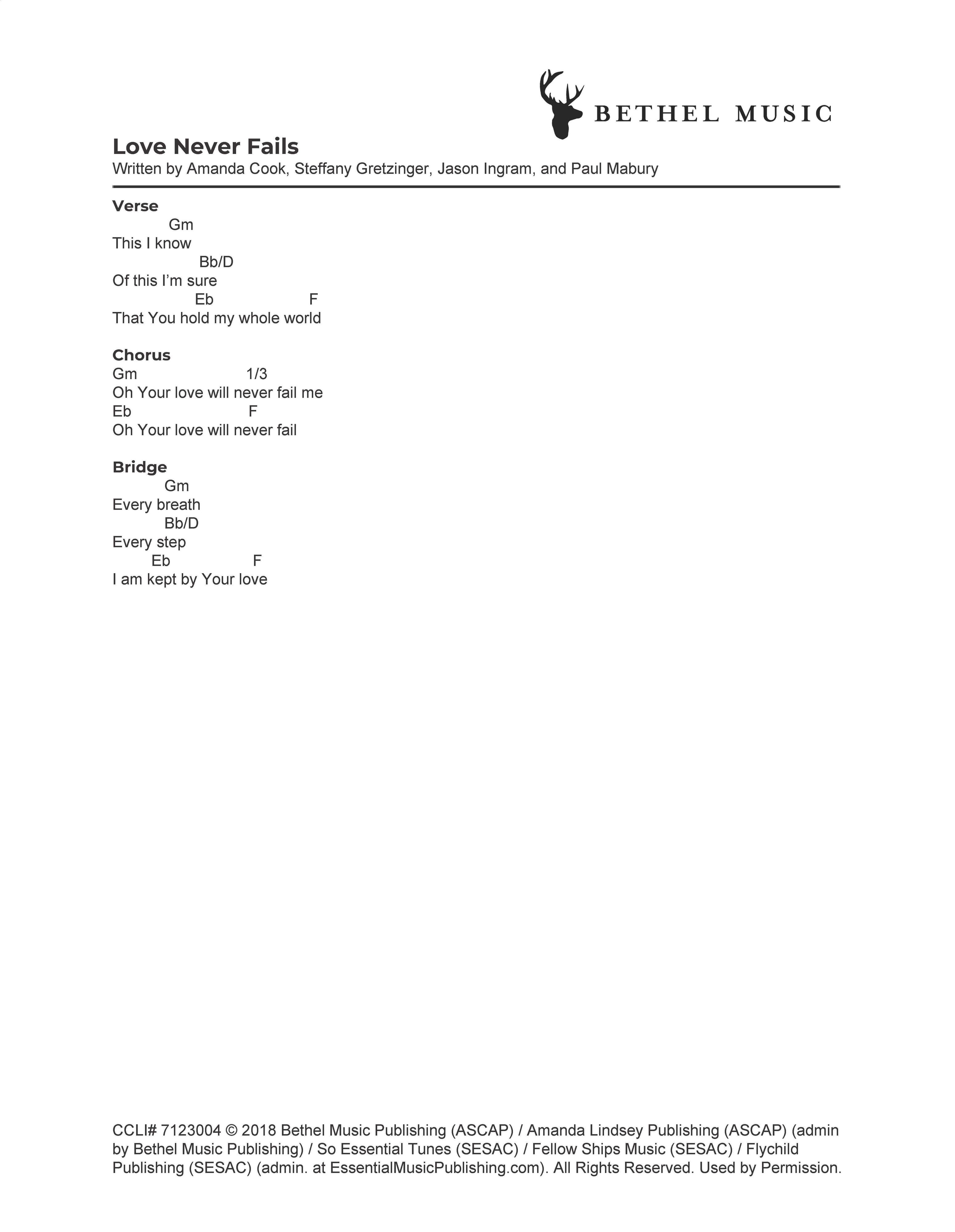© 2018 Bethel Music Publishing (ASCAP) / Amanda Lindsey Publishing (ASCAP) (admin by Bethel Music Publishing) / So Essential Tunes (SESAC) / Fellow Ships Music (SESAC) / Flychild Publishing (SESAC) (admin. at EssentialMusicPublishing.com). All Rights Reserved. Used by Permission.