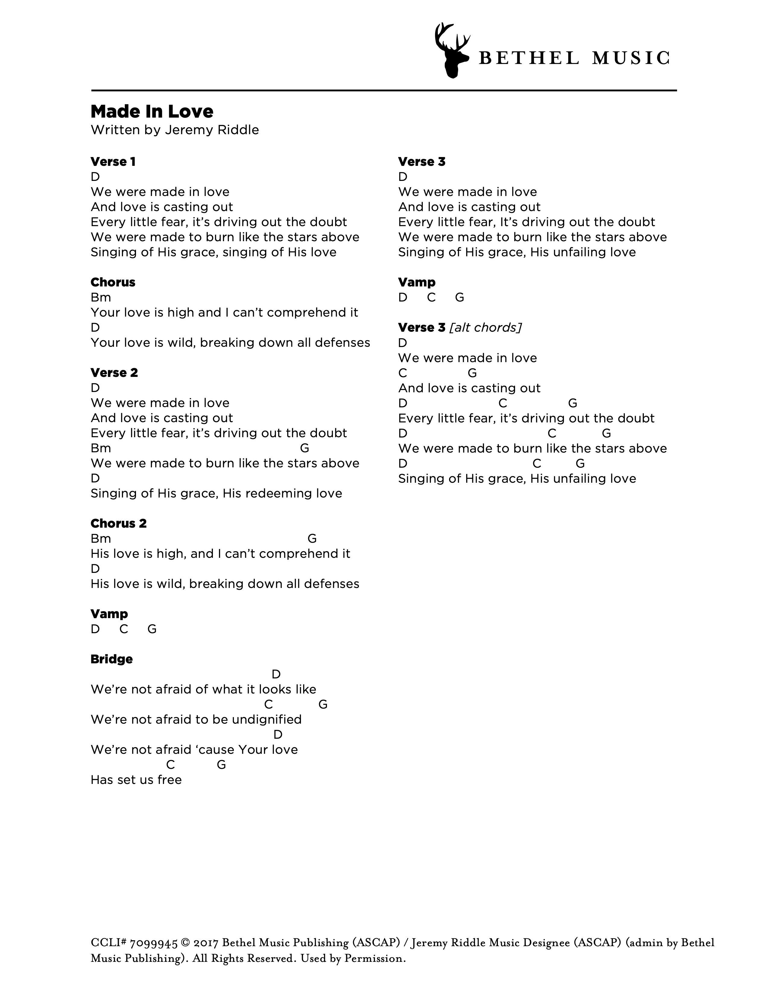 © 2017 Bethel Music Publishing (ASCAP) / Jeremy Riddle Music Designee (ASCAP) (admin by Bethel Music Publishing). All Rights Reserved. Used by Permission.