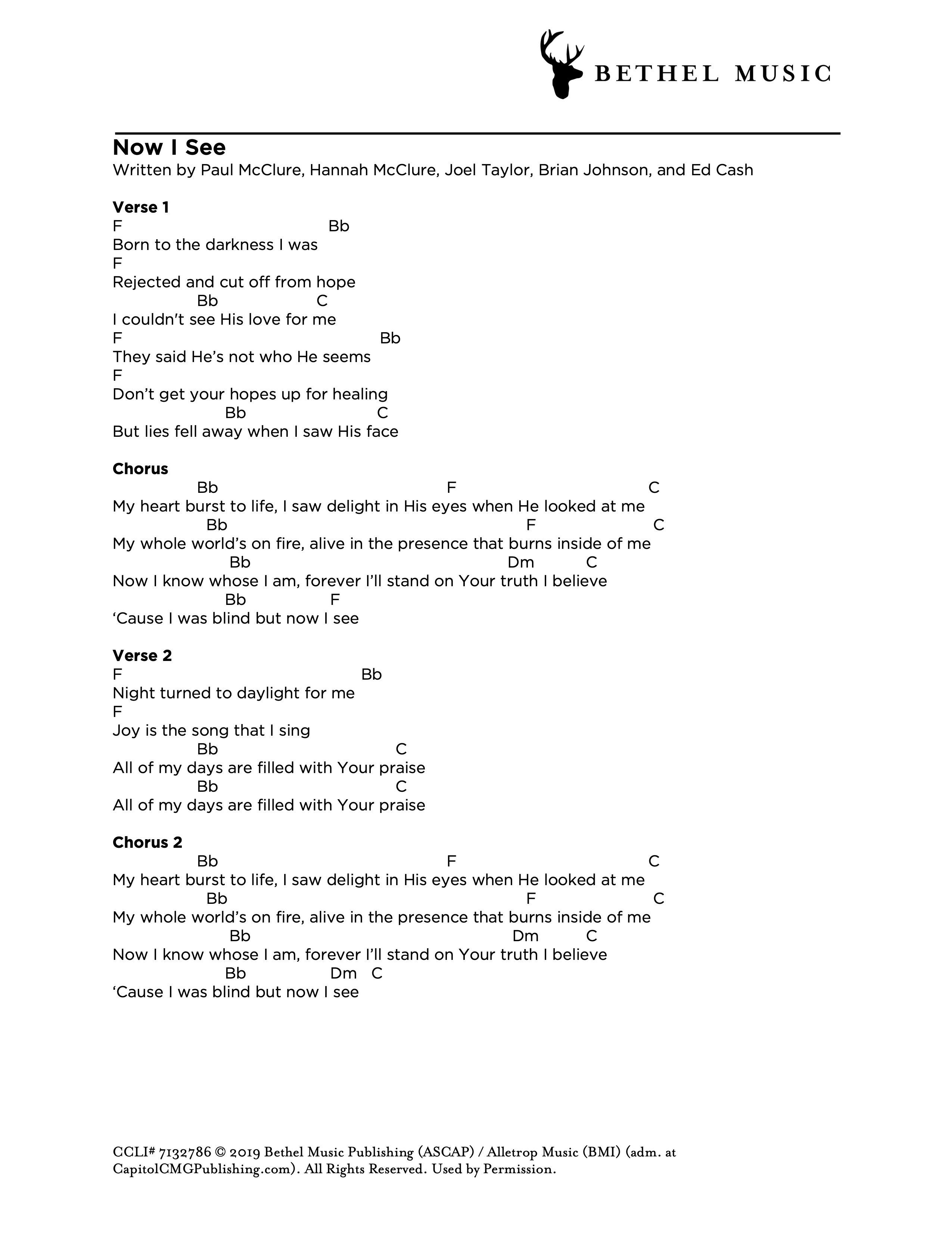 © 2019 Bethel Music Publishing (ASCAP) / Alletrop Music (BMI) (adm. at CapitolCMGPublishing.com). All Rights Reserved. Used by Permission.