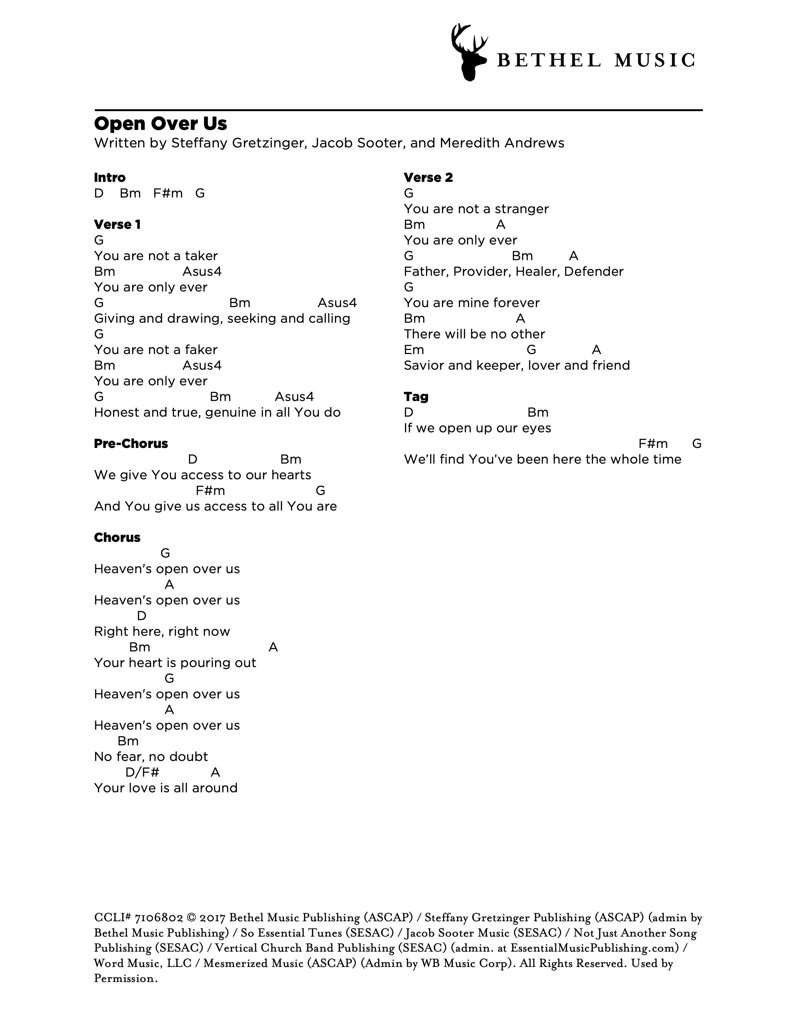 © 2017 Bethel Music Publishing (ASCAP) / Steffany Gretzinger Publishing (ASCAP) (admin by Bethel Music Publishing) / So Essential Tunes (SESAC) / Jacob Sooter Music (SESAC) / Not Just Another Song Publishing (SESAC) / Vertical Church Band Publishing (SESAC) (admin. at EssentialMusicPublishing.com) / Word Music, LLC / Mesmerized Music (ASCAP) (Admin by WB Music Corp). All Rights Reserved. Used by Permission.
