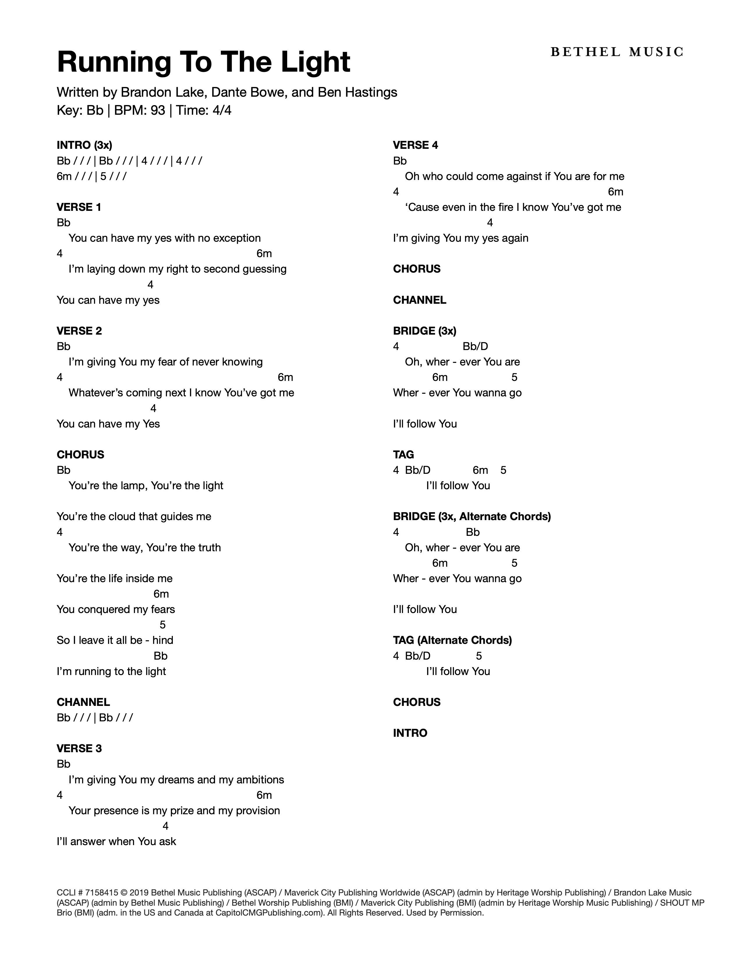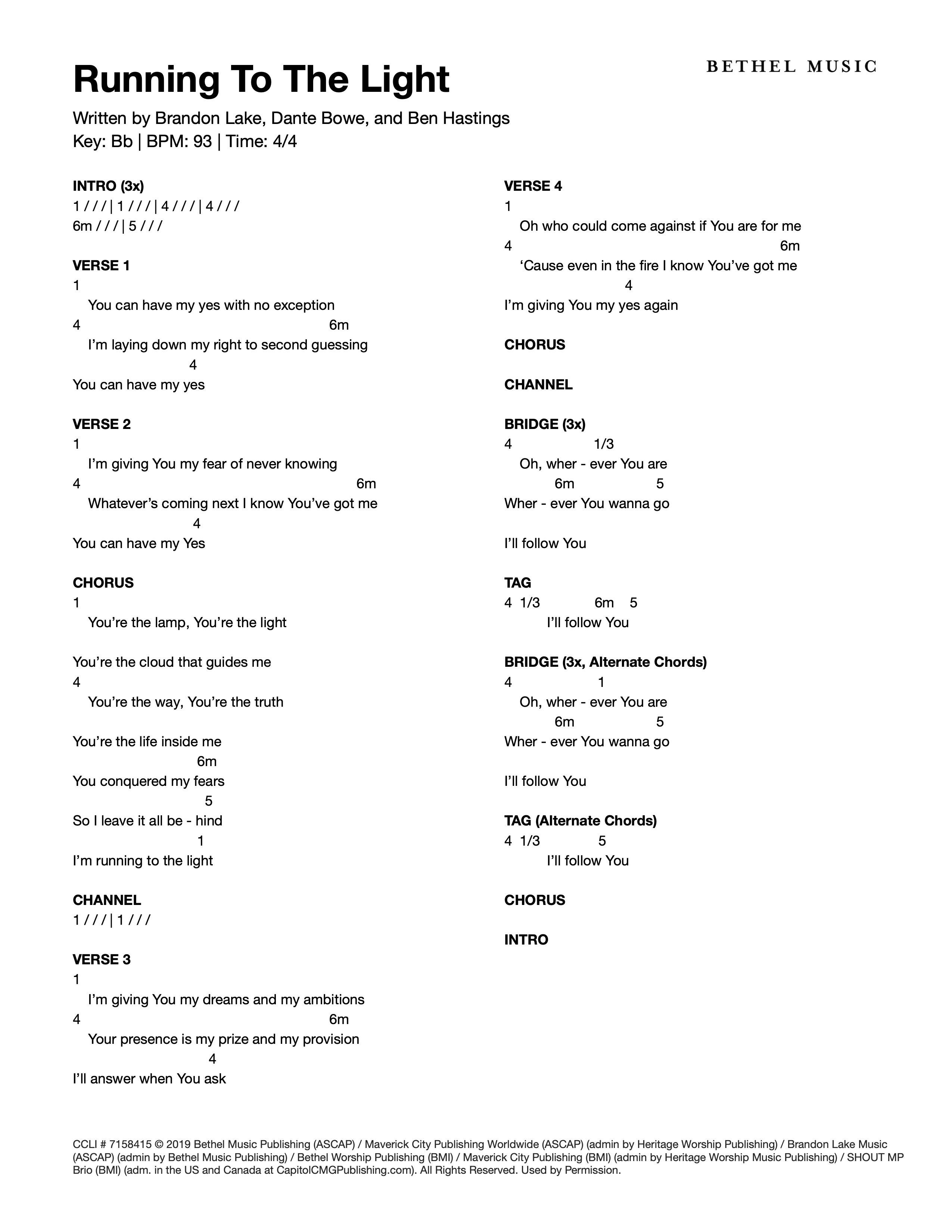 © 2019 Bethel Music Publishing (ASCAP) / Maverick City Publishing Worldwide (ASCAP) (admin by Heritage Worship Publishing) / Brandon Lake Music (ASCAP) (admin by Bethel Music Publishing) / Bethel Worship Publishing (BMI) / Maverick City Publishing (BMI) (admin by Heritage Worship Music Publishing) / SHOUT MP Brio (BMI) (adm. in the US and Canada at CapitolCMGPublishing.com). All Rights Reserved. Used by Permission.