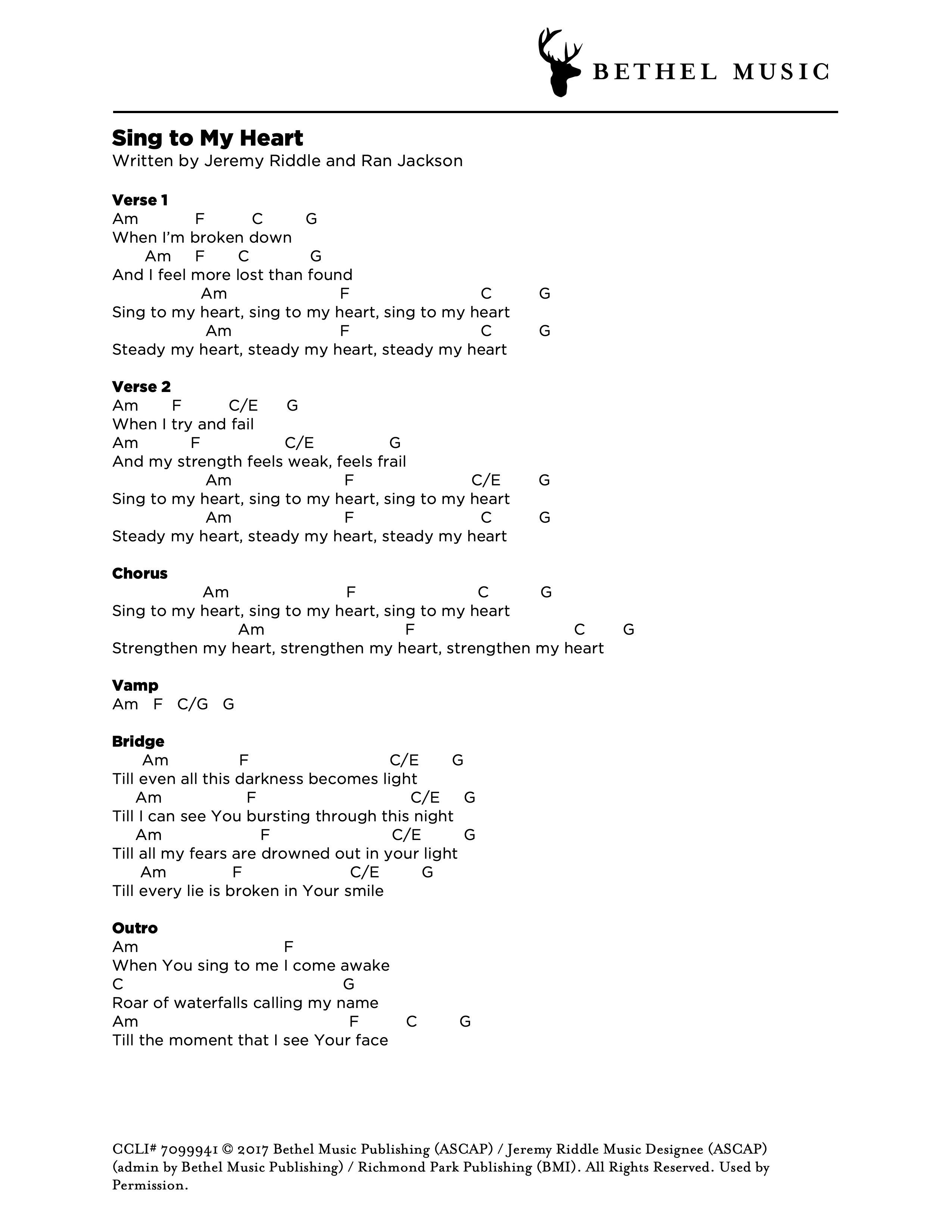 © 2017 Bethel Music Publishing (ASCAP) / Jeremy Riddle Music Designee (ASCAP) (admin by Bethel Music Publishing) / Richmond Park Publishing (BMI) (admin. at EssentialMusicPublishing.com). All Rights Reserved. Used by Permission.