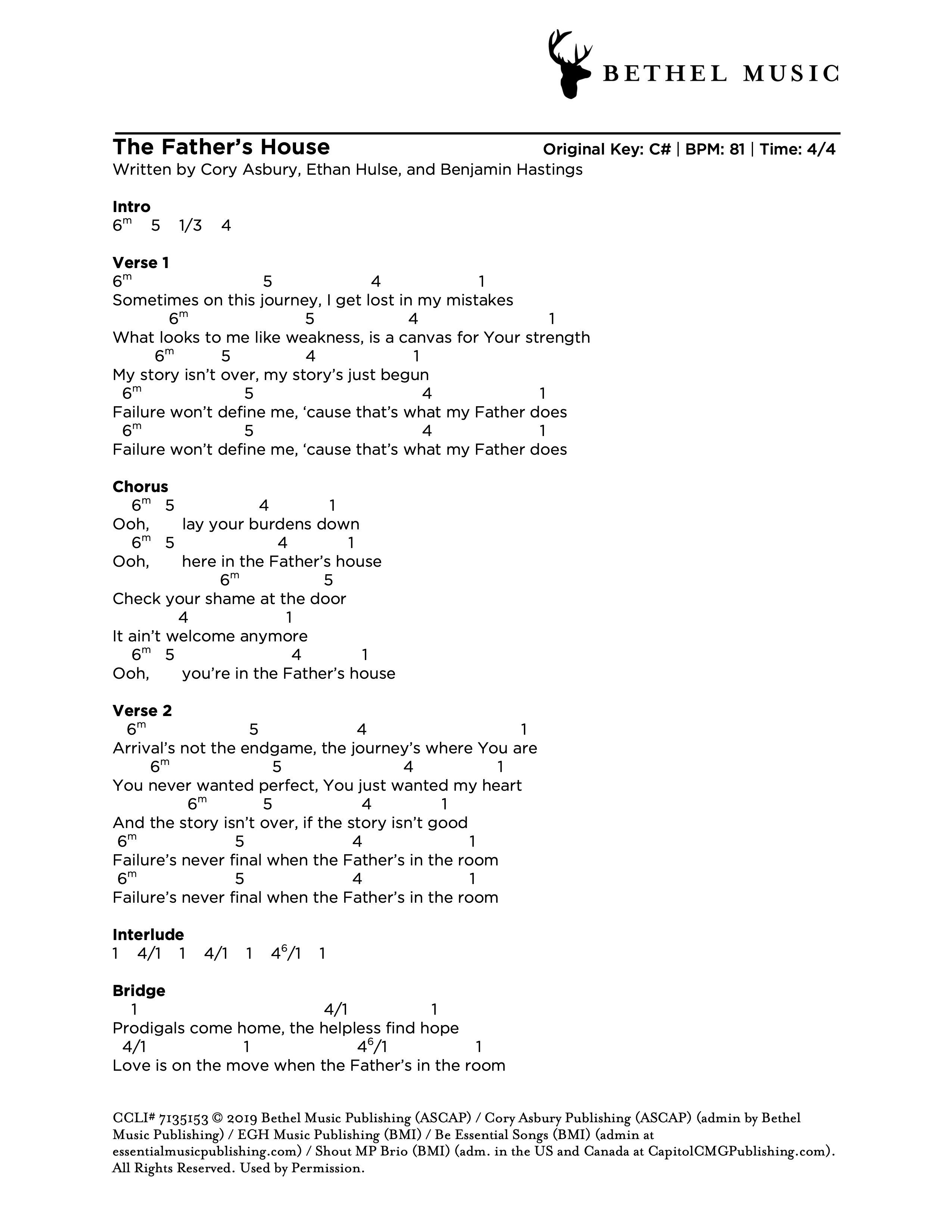 © 2019 Bethel Music Publishing (ASCAP) / Cory Asbury Publishing (ASCAP) (admin by Bethel Music Publishing) / EGH Music Publishing (BMI) / Be Essential Songs (BMI) (admin at EssentialMusicPublishing.com) / Shout MP Brio (BMI) (adm. in the US and Canada at CapitolCMGPublishing.com). All Rights Reserved. Used by Permission.