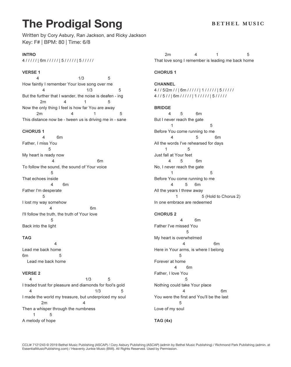© 2019 Bethel Music Publishing (ASCAP) / Cory Asbury Publishing (ASCAP) (admin by Bethel Music Publishing) / Richmond Park Publishing (admin. at EssentialMusicPublishing.com) / Heavenly Junkie Music (BMI). All Rights Reserved. Used by Permission.
