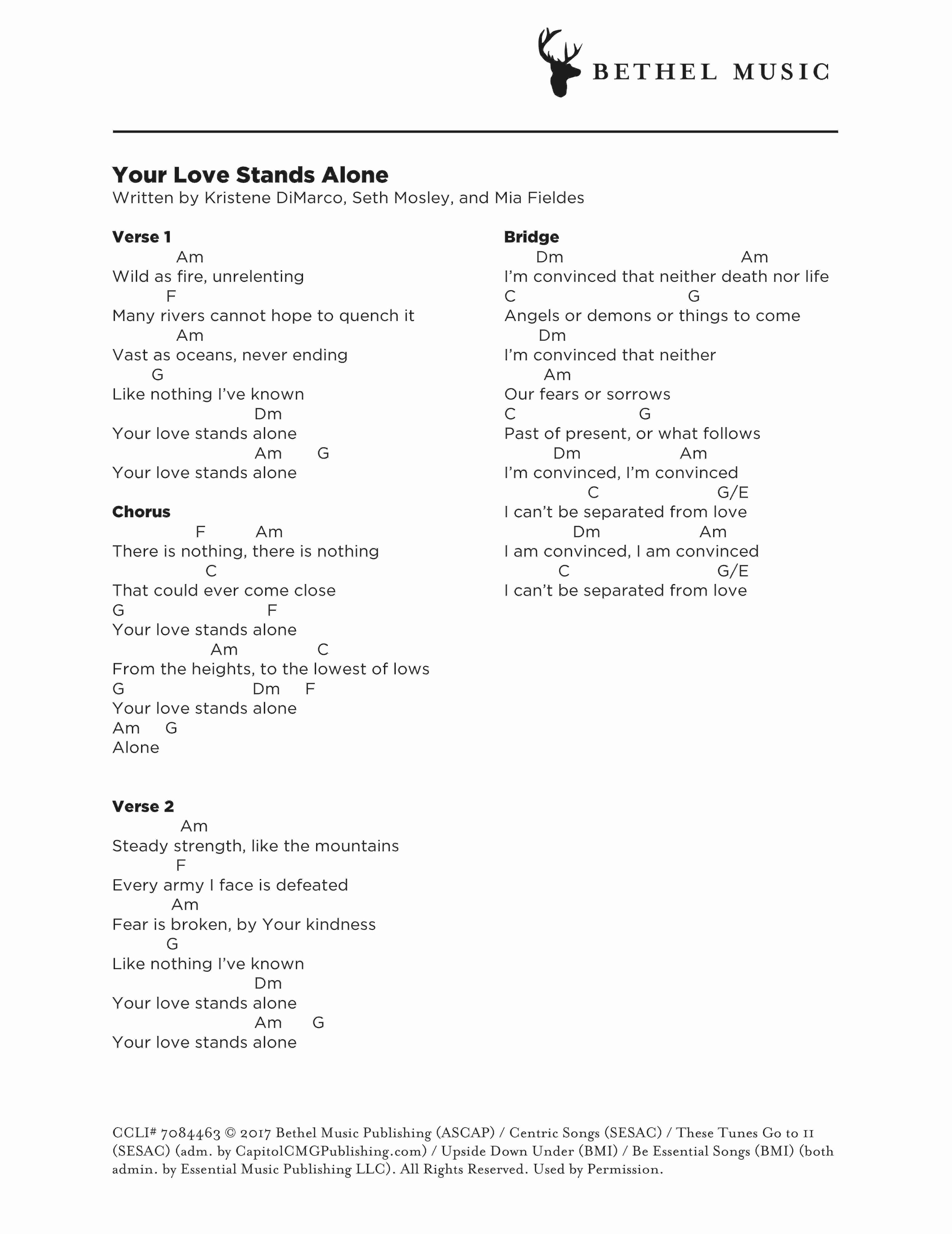 © 2017 Bethel Music Publishing (ASCAP) / Centric Songs (SESAC) / These Tunes Go to 11 (SESAC) (adm. by CapitolCMGPublishing.com) / Upside Down Under (BMI) / Be Essential Songs (BMI) (both admin. by Essential Music Publishing LLC). All Rights Reserved. Used by Permission.