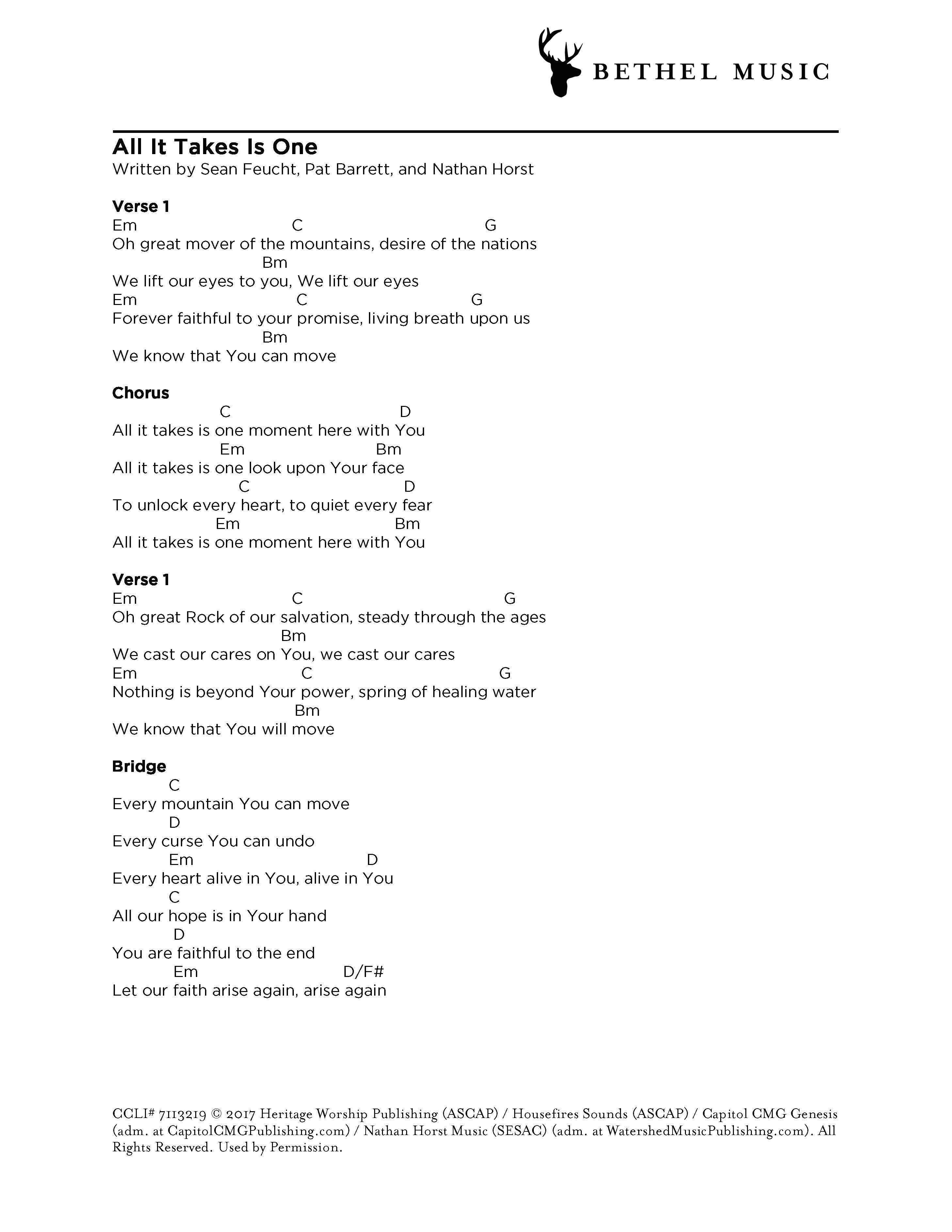 © 2017 Heritage Worship Publishing (ASCAP) / Housefires Sounds (ASCAP) / Capitol CMG Genesis (ASCAP) (Adm. at CapitolCMGPublishing.com) / Nathan Horst Music (SESAC). All Rights Reserved. Used by Permission.