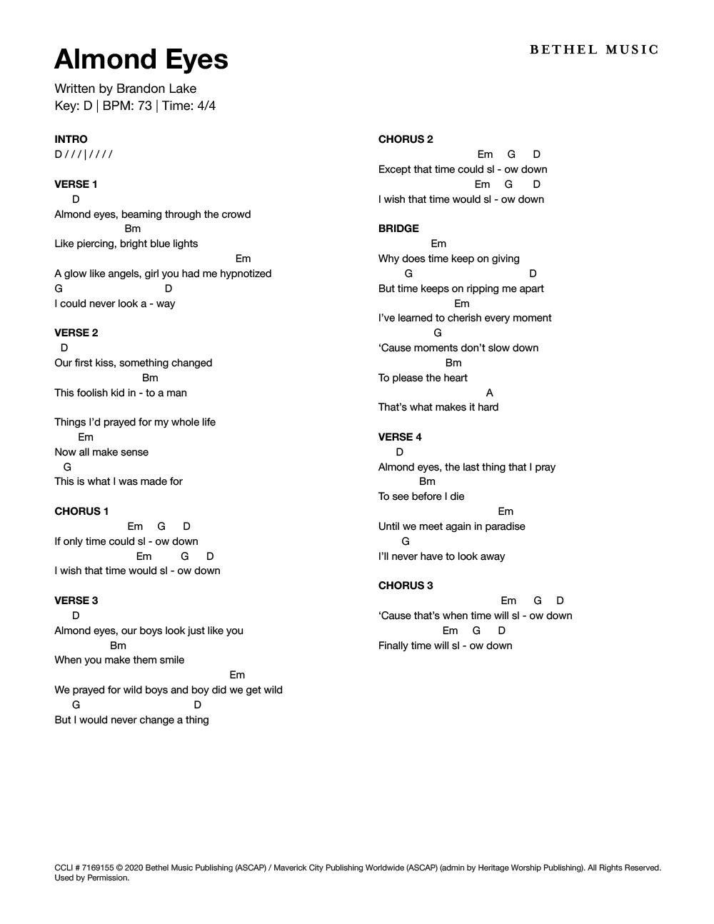 © 2020 Bethel Music Publishing (ASCAP) / Maverick City Publishing Worldwide (ASCAP) (admin by Heritage Worship Publishing) / Brandon Lake Music (ASCAP) (admin by Bethel Music Publishing). All Rights Reserved. Used by Permission.
