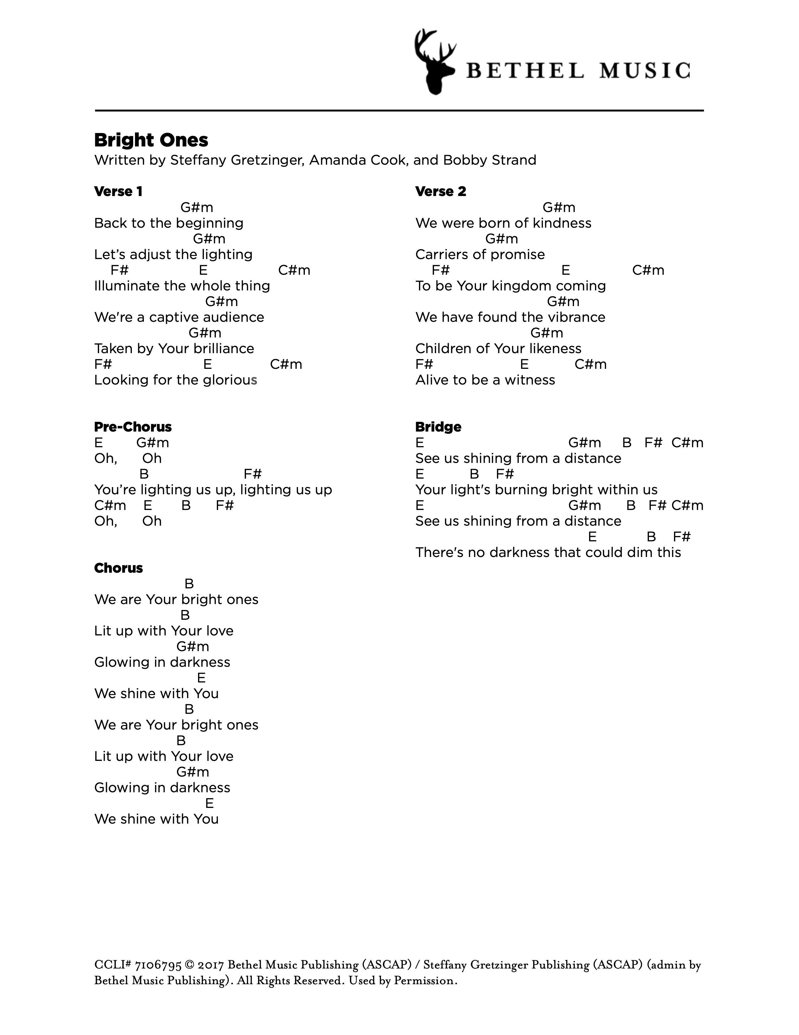 © 2017 Bethel Music Publishing (ASCAP) / Steffany Gretzinger Publishing (ASCAP) (admin by Bethel Music Publishing) / Bobby Strand Publishing (ASCAP) (admin by Bethel Music Publishing). All Rights Reserved. Used by Permission.