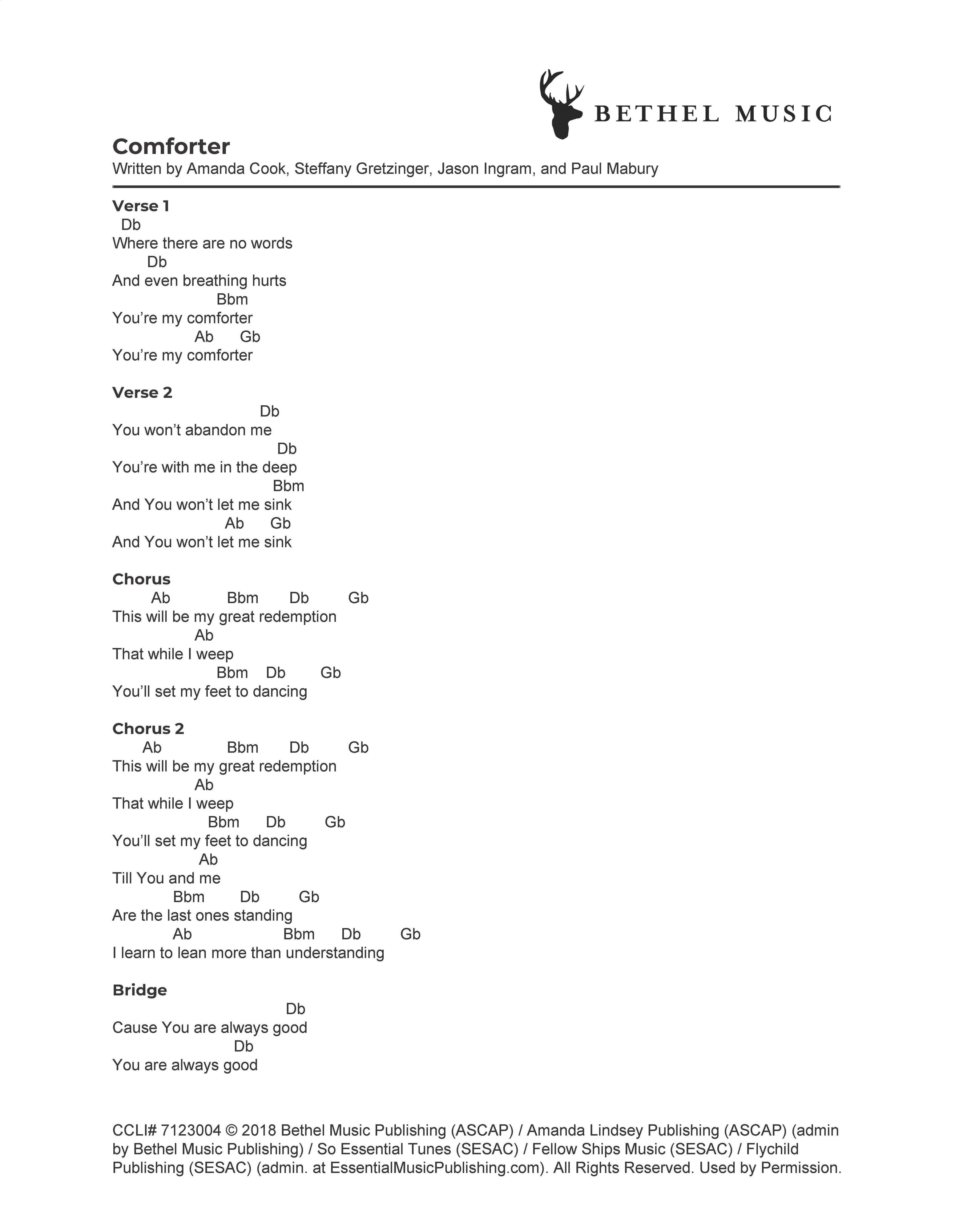 © 2018 Bethel Music Publishing (ASCAP) / Amanda Lindsey Publishing (ASCAP) (admin by Bethel Music Publishing) / So Essential Tunes (SESAC) / Fellow Ships Music (SESAC) / Flychild Publishing (SESAC) (admin. at EssentialMusicPublishing.com). All Rights Reserved. Used by Permission.