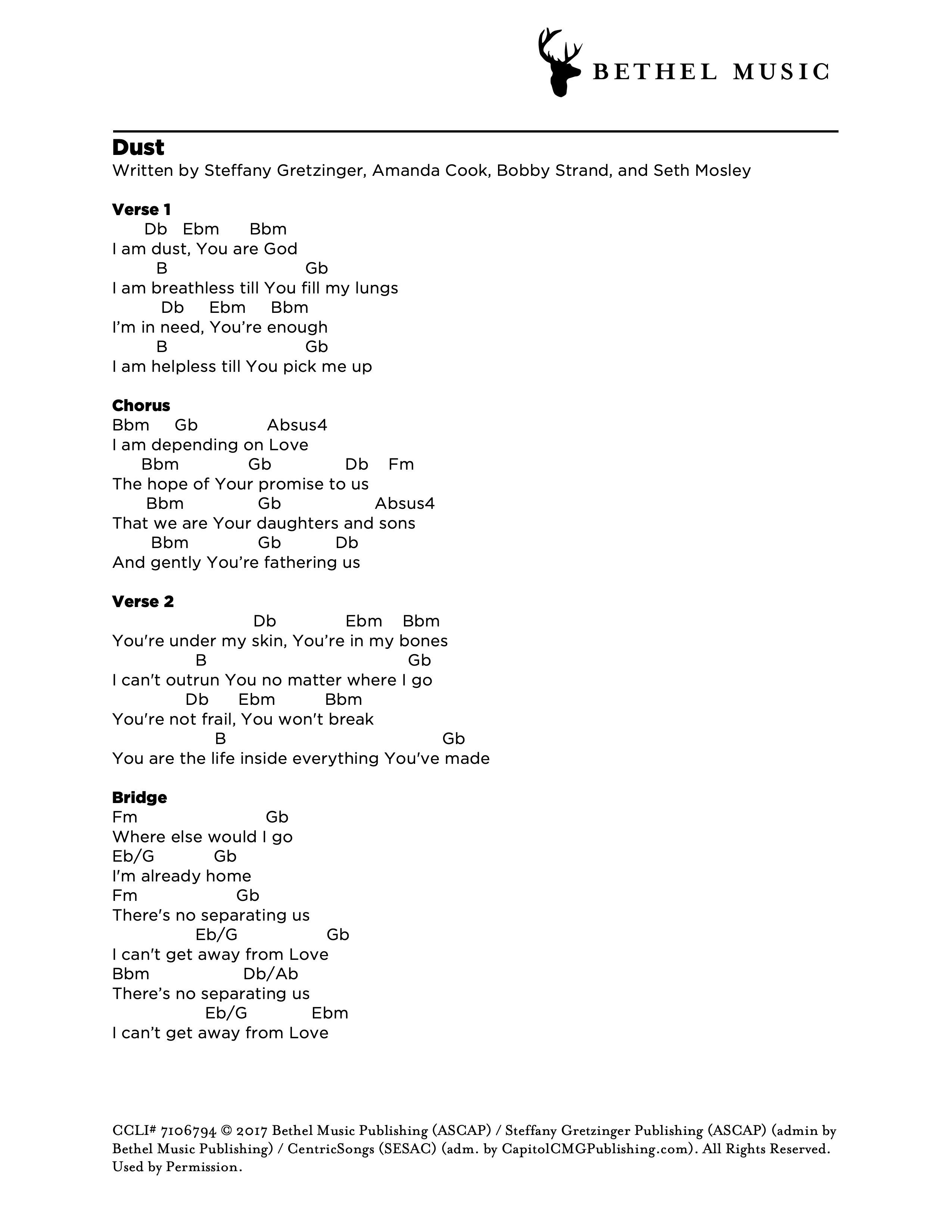 © 2017 Bethel Music Publishing (ASCAP) / Steffany Gretzinger Publishing (ASCAP) (admin by Bethel Music Publishing) / Bobby Strand Publishing (ASCAP) (admin by Bethel Music Publishing) / CentricSongs (SESAC) (adm. by CapitolCMGPublishing.com). All Rights Reserved. Used by Permission.