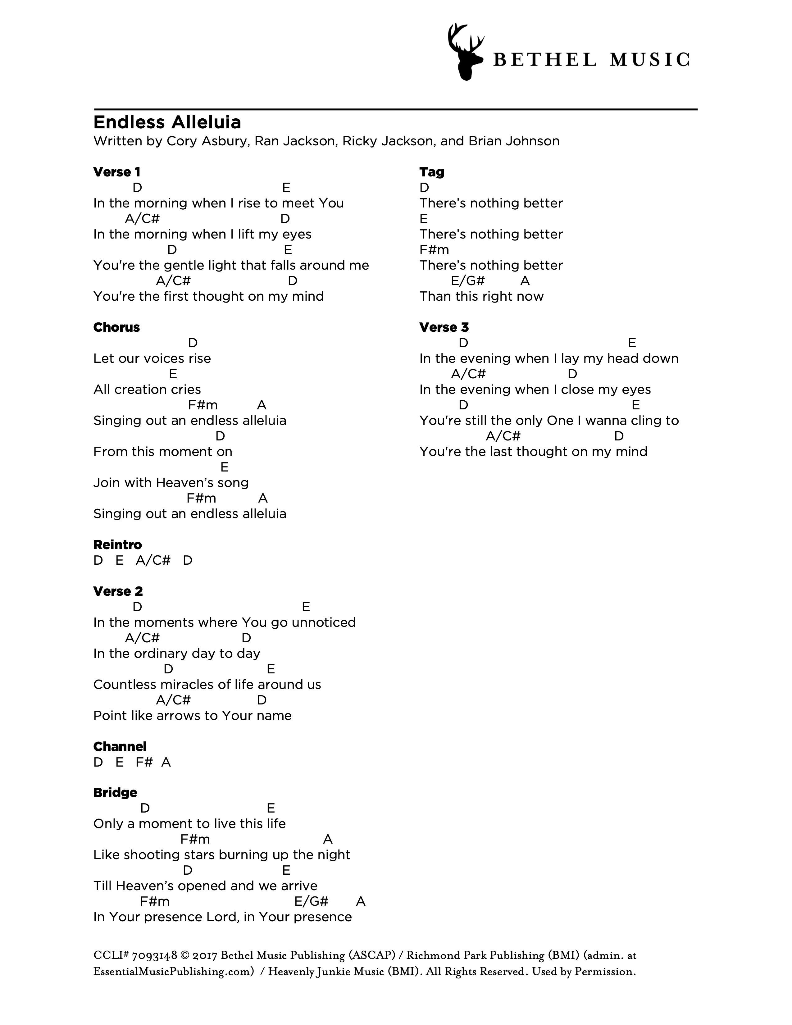 © 2017 Bethel Music Publishing (ASCAP) / Cory Asbury Publishing (ASCAP) (admin by Bethel Music Publishing) / Richmond Park Publishing (BMI) / Be Essential Songs (BMI) / Ricky Jackson Publishing Designee (BMI) (admin. at EssentialMusicPublishing.com). All Rights Reserved. Used by Permission.