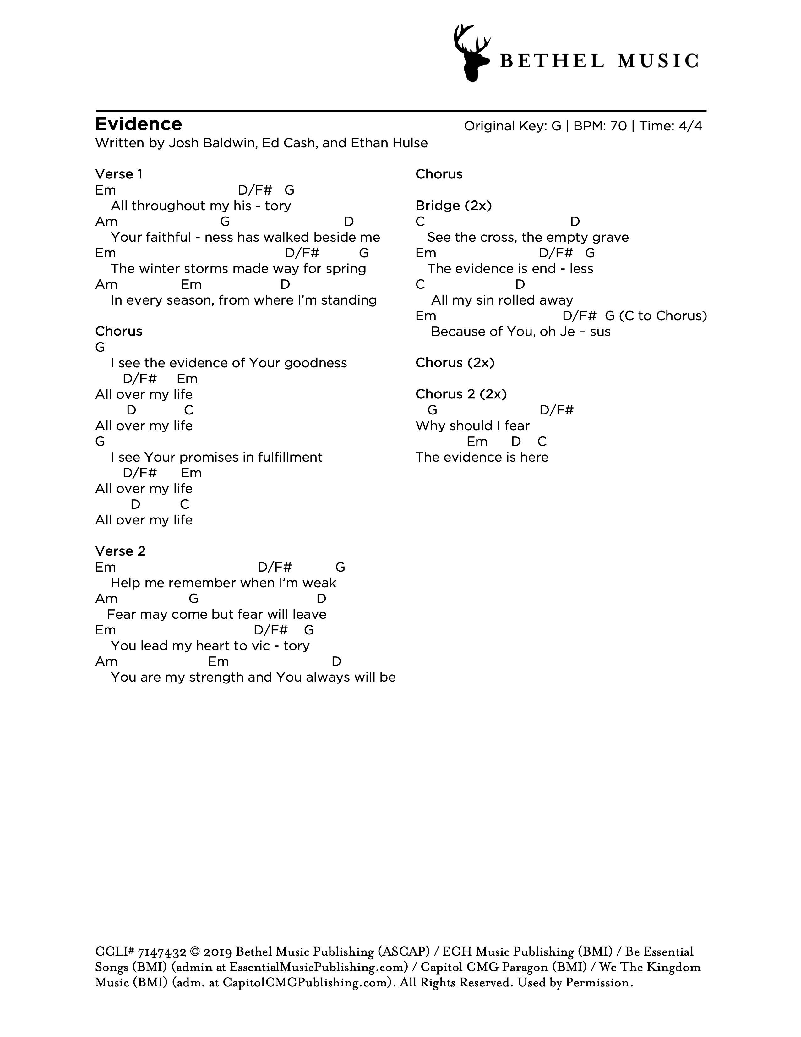© 2019 Bethel Music Publishing (ASCAP) / EGH Music Publishing (BMI) / Be Essential Songs (BMI) (admin at EssentialMusicPublishing.com) / Capitol CMG Paragon (BMI) / We The Kingdom Music (BMI) (adm. at CapitolCMGPublishing.com). All Rights Reserved. Used by Permission.