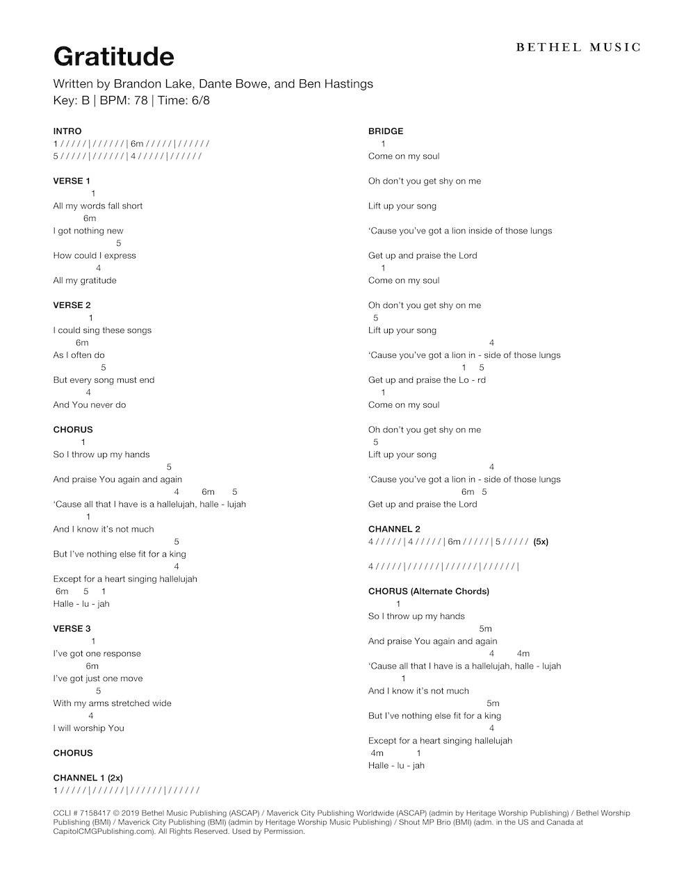© 2019 Bethel Music Publishing (ASCAP) / Maverick City Publishing Worldwide (ASCAP) (admin by Heritage Worship Publishing) / Brandon Lake Music (ASCAP) (admin by Bethel Music Publishing) / Bethel Worship Publishing (BMI) / Maverick City Publishing (BMI) (admin by Heritage Worship Music Publishing) / Shout MP Brio (BMI) (adm. in the US and Canada at CapitolCMGPublishing.com). All Rights Reserved. Used by Permission.