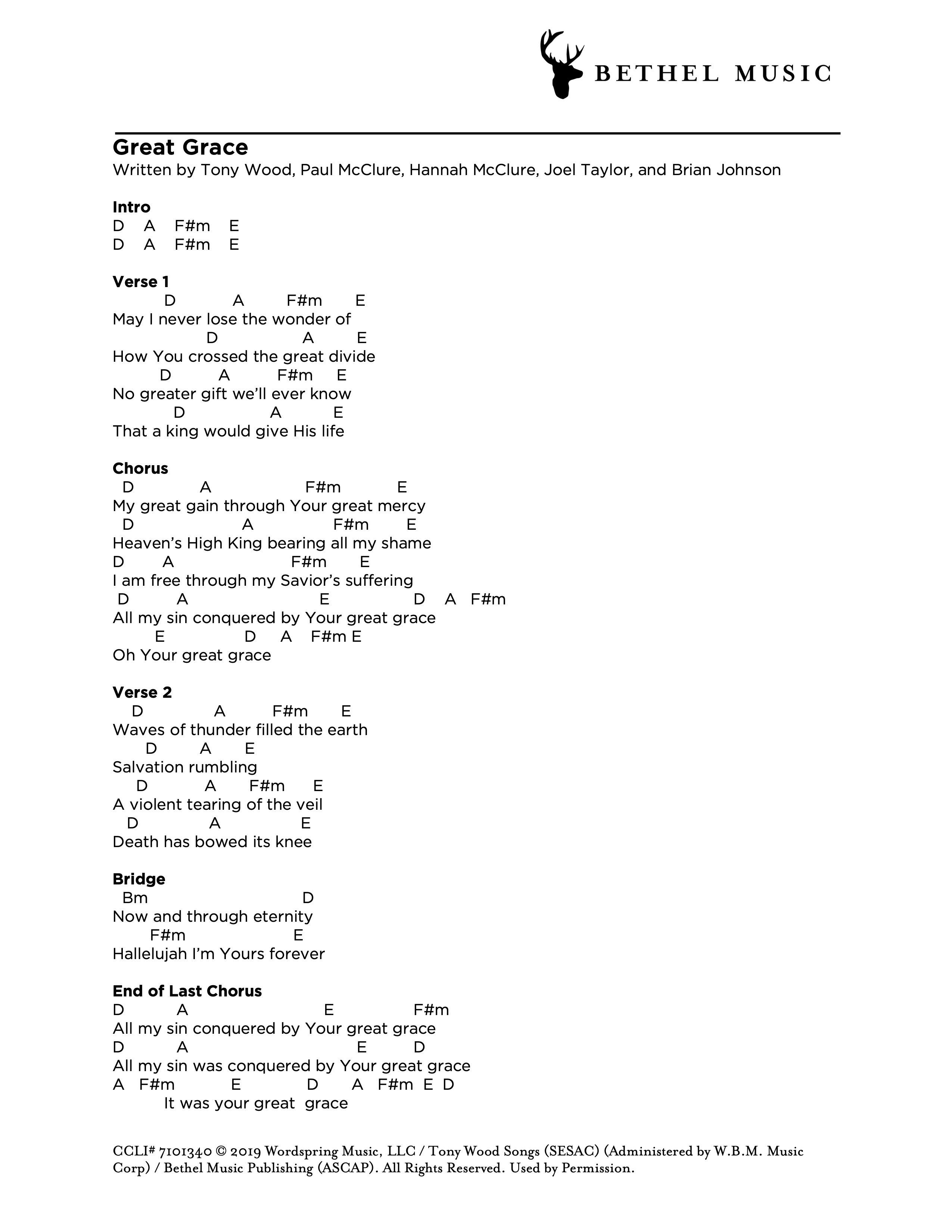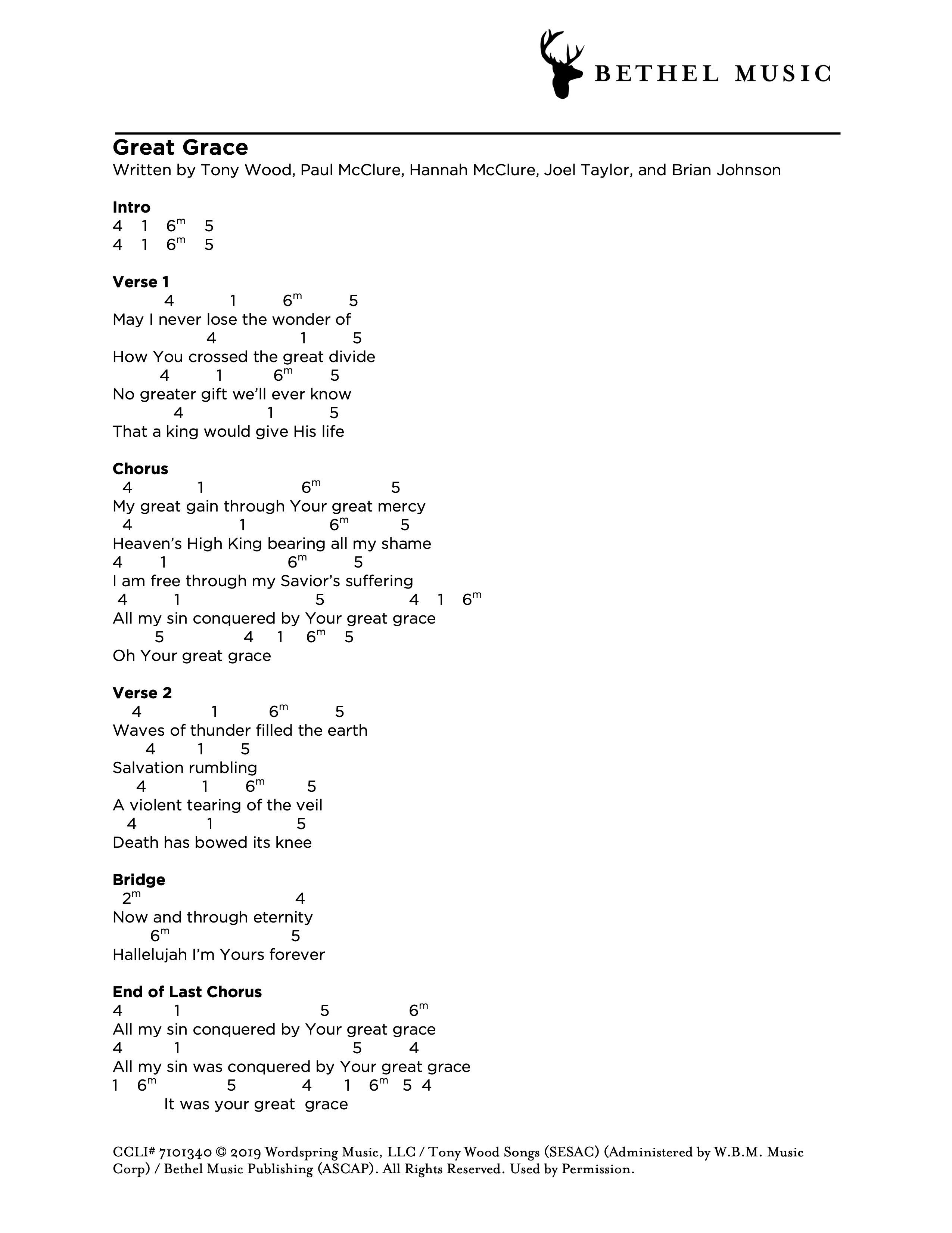 © 2019 Wordspring Music, LLC / Tony Wood Songs (SESAC) (Administered by W.B.M. Music Corp) / Bethel Music Publishing (ASCAP). All Rights Reserved. Used by Permission.