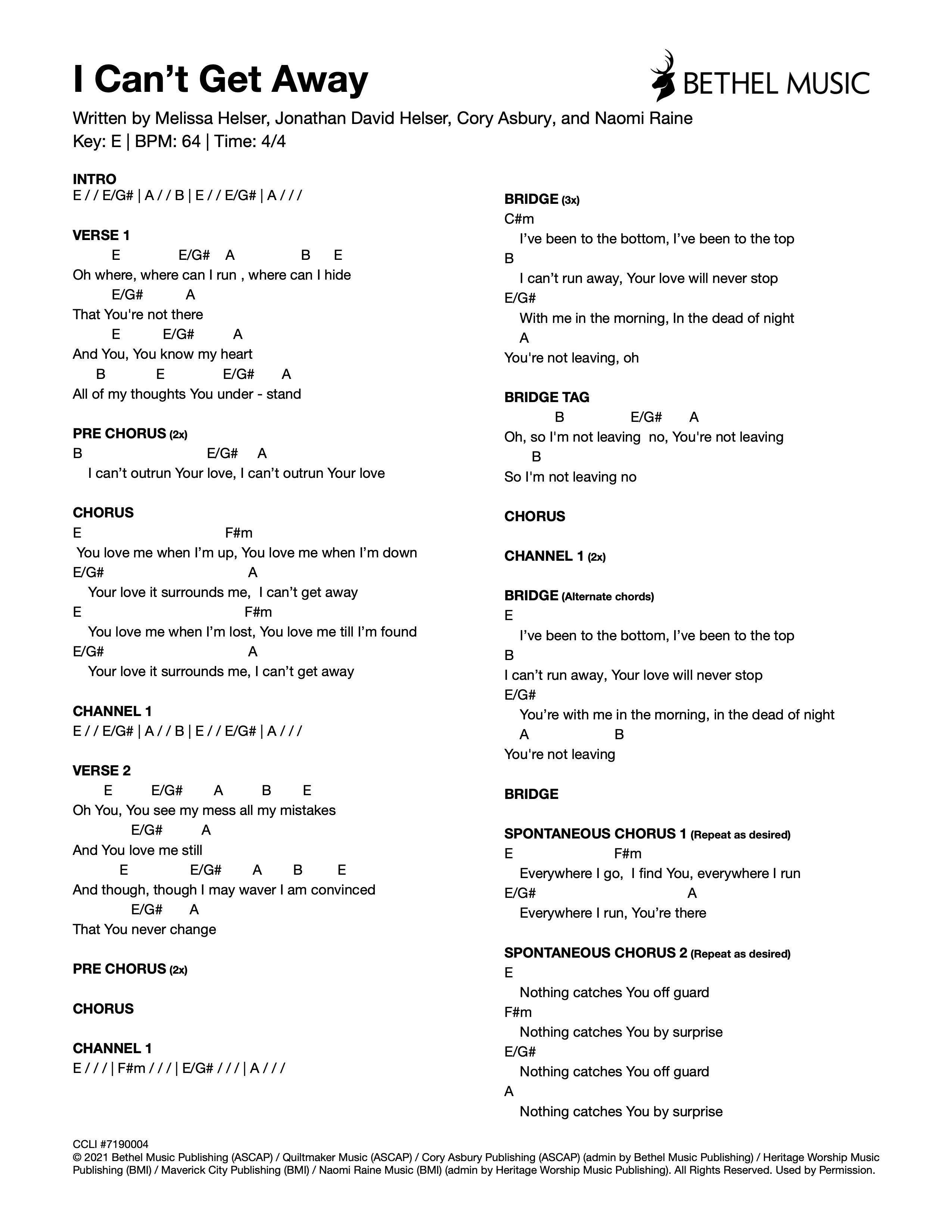 © 2021 Bethel Music Publishing (ASCAP) / Quiltmaker Music (ASCAP) / Cory Asbury Publishing (ASCAP) (admin by Bethel Music Publishing) / Heritage Worship Music Publishing (BMI) / Maverick City Publishing (BMI) / Naomi Raine Music (BMI) (admin by Heritage Worship Music Publishing). All Rights Reserved. Used by Permission.