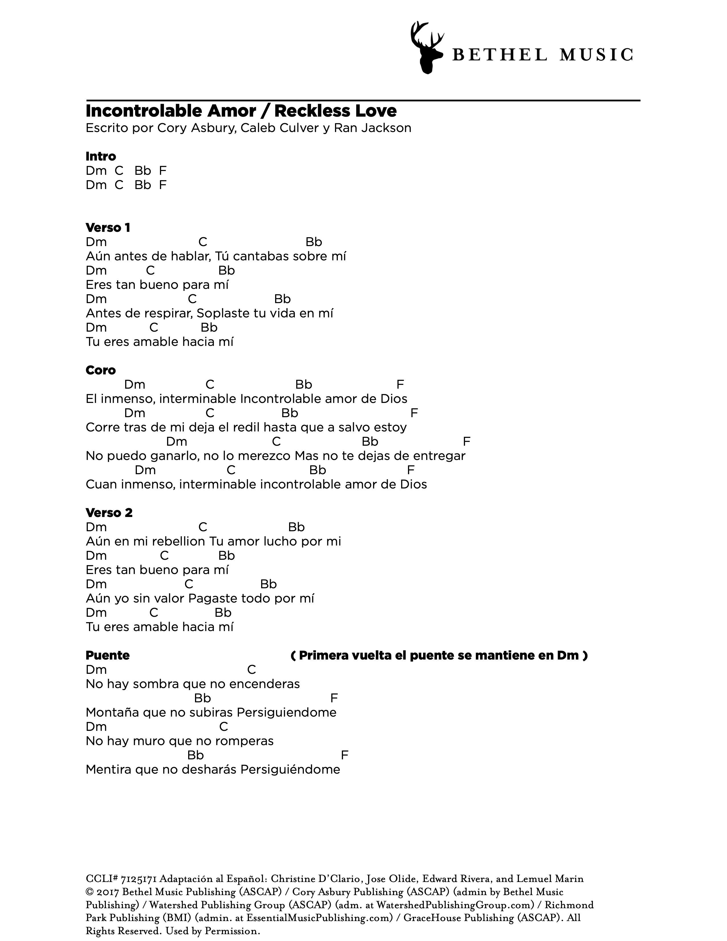 Adaptación al Español: Christine D’Clario, Jose Olide, Edward Rivera, and Lemuel Marin © 2018 Bethel Music Publishing (ASCAP) / Cory Asbury Publishing (ASCAP) (admin by Bethel Music Publishing) / Watershed Publishing Group (ASCAP) (adm. at WatershedPublishingGroup.com) / Richmond Park Publishing (BMI) (admin. at EssentialMusicPublishing.com) / Aliento Music Group (ASCAP). All Rights Reserved. Used by Permission.