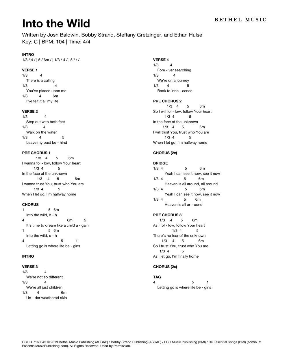 © 2019 Bethel Music Publishing (ASCAP) / Bobby Strand Publishing (ASCAP) / EGH Music Publishing (BMI) / Be Essential Songs (BMI) (admin. at EssentialMusicPublishing.com). All Rights Reserved. Used by Permission.