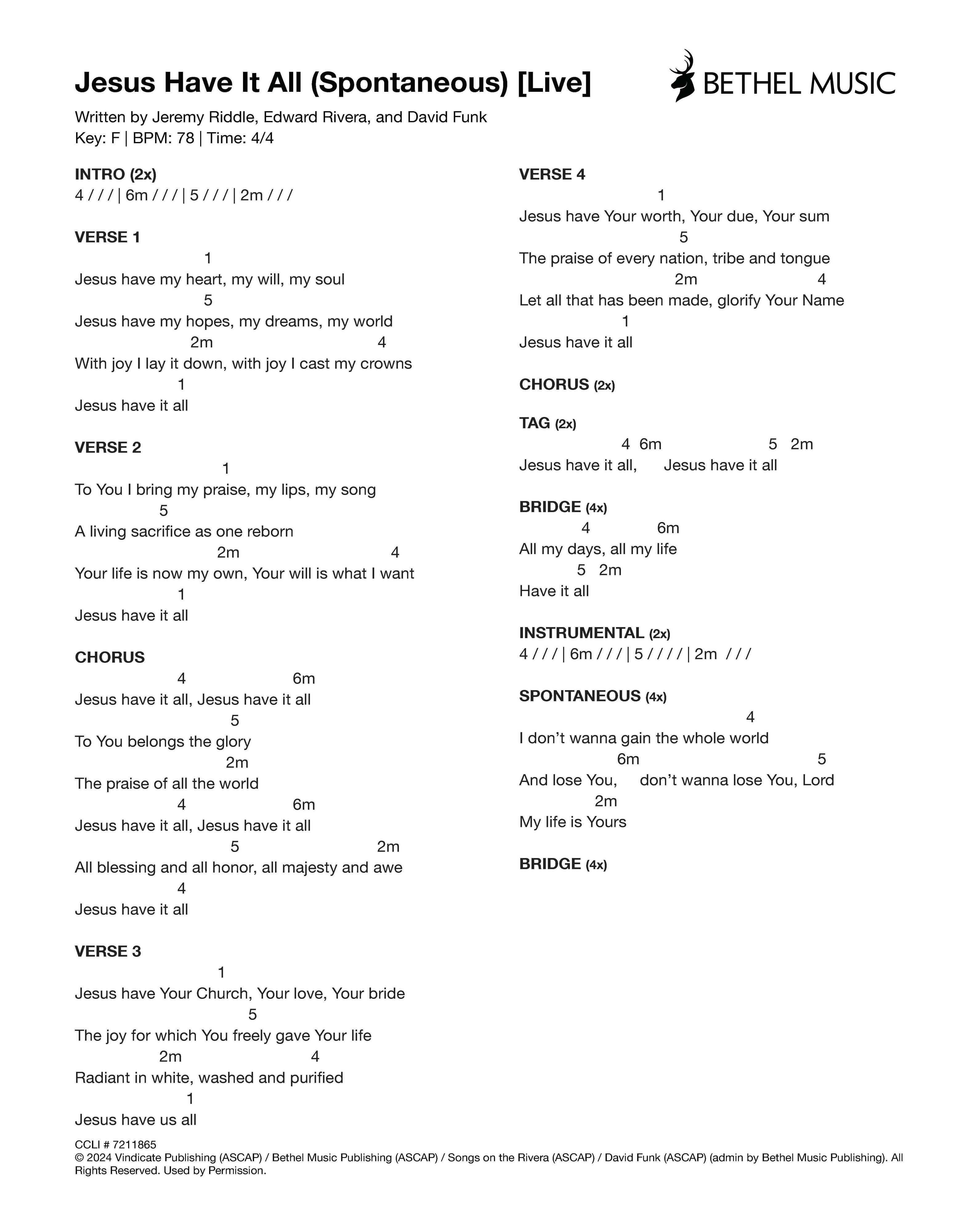© 2024 Vindicate Publishing (ASCAP) / Bethel Music Publishing (ASCAP) / Songs on the Rivera (ASCAP) / David Funk (ASCAP) (admin by Bethel Music Publishing). All Rights Reserved. Used by Permission.