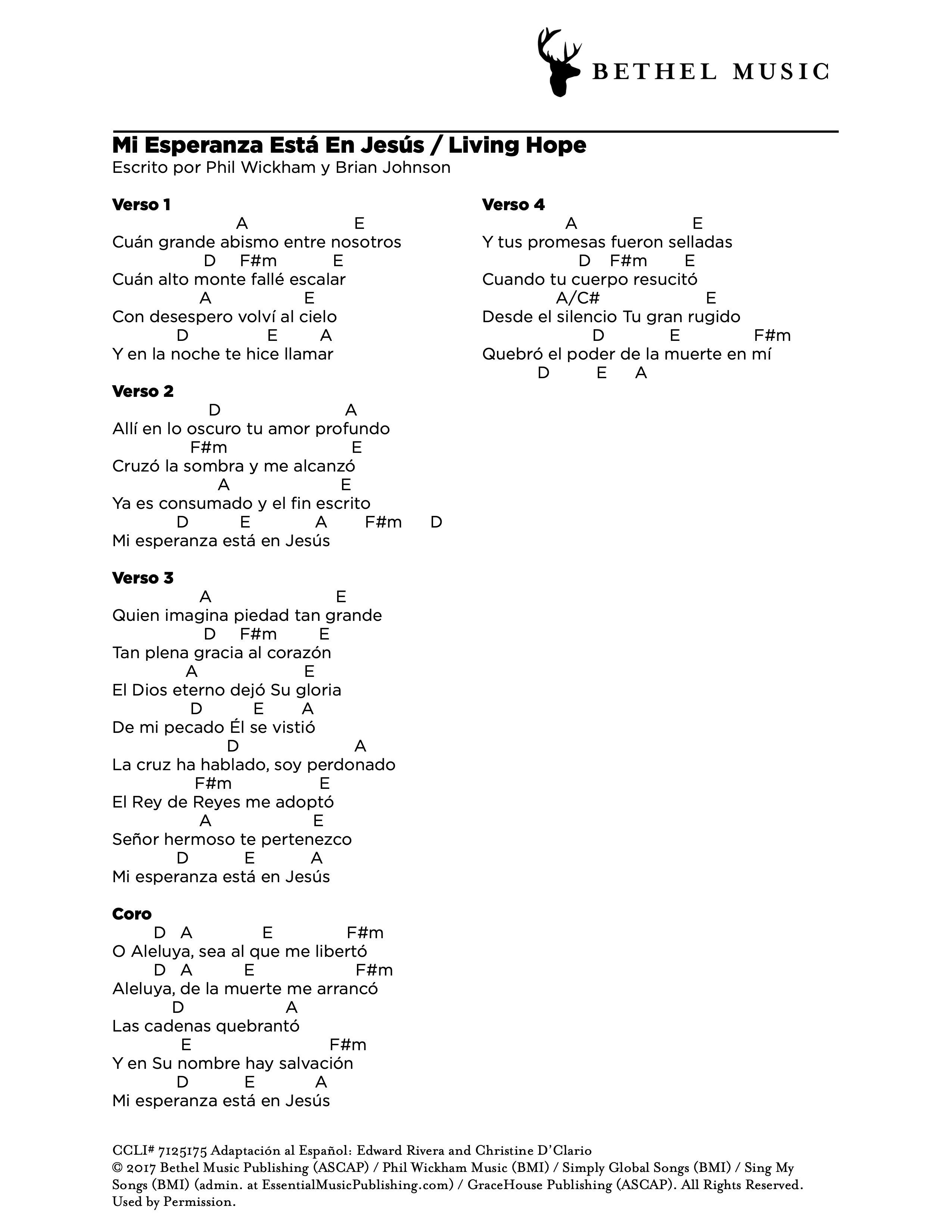 Adaptación al Español: Edward Rivera and Christine D’Clario © 2018 Bethel Music Publishing (ASCAP) / Phil Wickham Music (BMI) / Simply Global Songs (BMI) / Sing My Songs (BMI) (admin. at EssentialMusicPublishing.com) / Aliento Music Group (ASCAP). All Rights Reserved. Used by Permission.