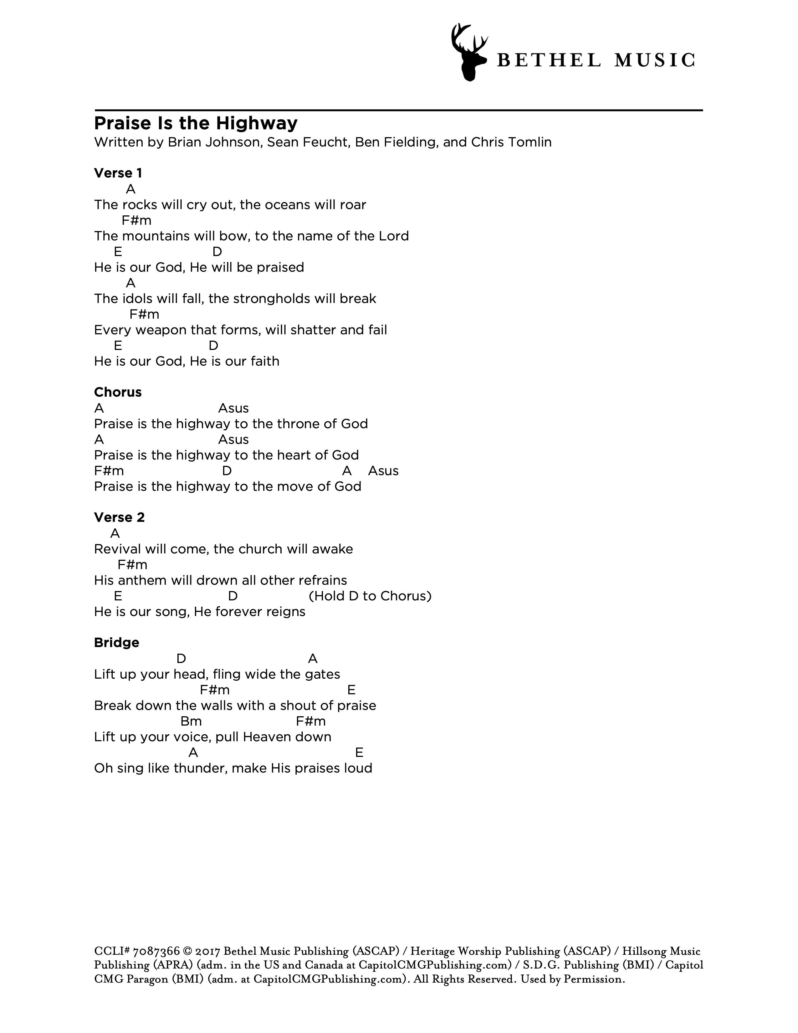 © 2017 Bethel Music Publishing (ASCAP) / Heritage Worship Publishing (ASCAP) / Hillsong Music Publishing (APRA) (adm. in the US and Canada at CapitolCMGPublishing.com) / S.D.G. Publishing (BMI) / Capitol CMG Paragon (BMI) (adm. at CapitolCMGPublishing.com). All Rights Reserved. Used by Permission.