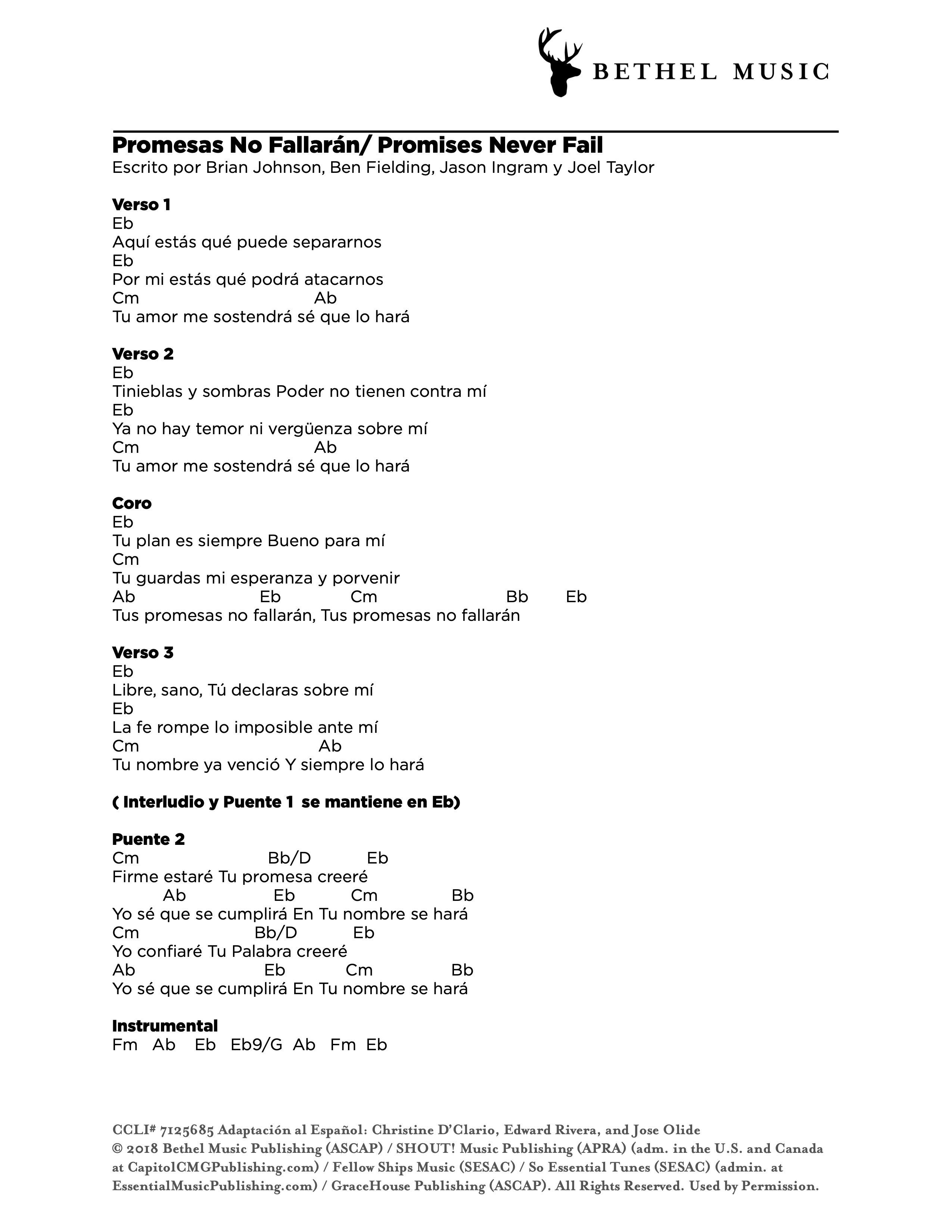 Adaptación al Español: Christine D’Clario, Edward Rivera, and Jose Olide © 2018 Bethel Music Publishing (ASCAP) / SHOUT! Music Publishing (APRA) (adm. in the U.S. and Canada at CapitolCMGPublishing.com) / Fellow Ships Music (SESAC) / So Essential Tunes (SESAC) (admin. at EssentialMusicPublishing.com) / GraceHouse Publishing (ASCAP). All Rights Reserved. Used by Permission.