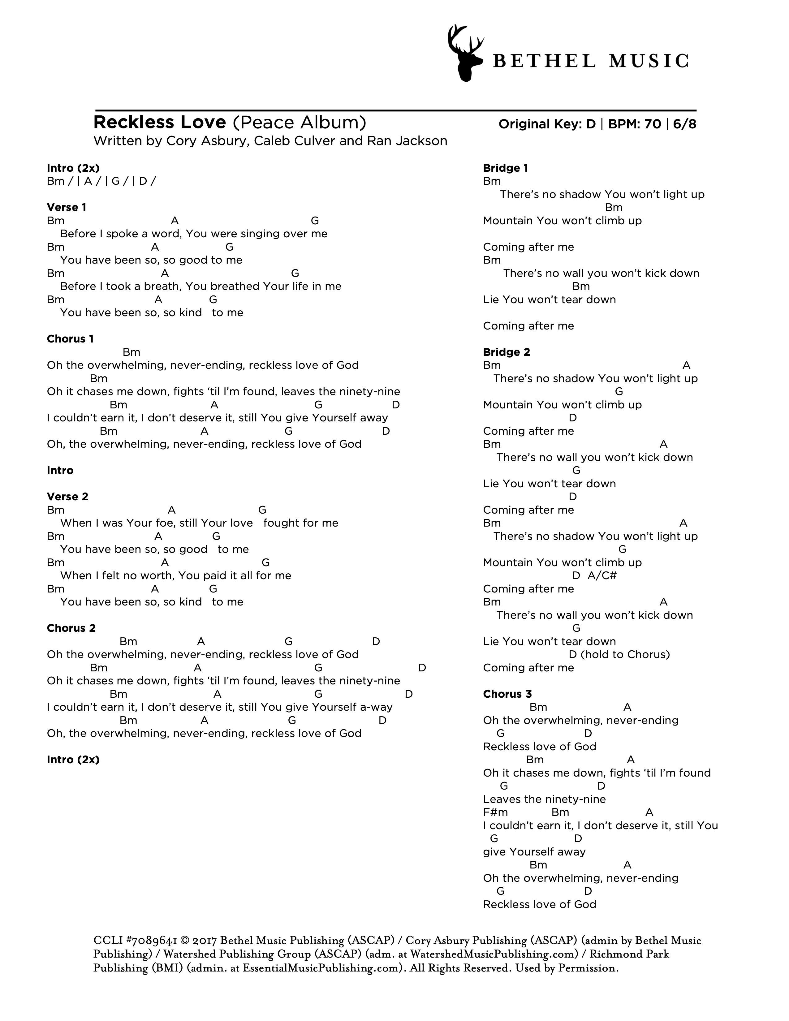 © 2017 Bethel Music Publishing (ASCAP) / Cory Asbury Publishing (ASCAP) (admin by Bethel Music Publishing) / Watershed Publishing Group (ASCAP) (adm. at WatershedMusicPublishing.com) / Richmond Park Publishing (BMI) (admin. at EssentialMusicPublishing.com). All Rights Reserved. Used by Permission.