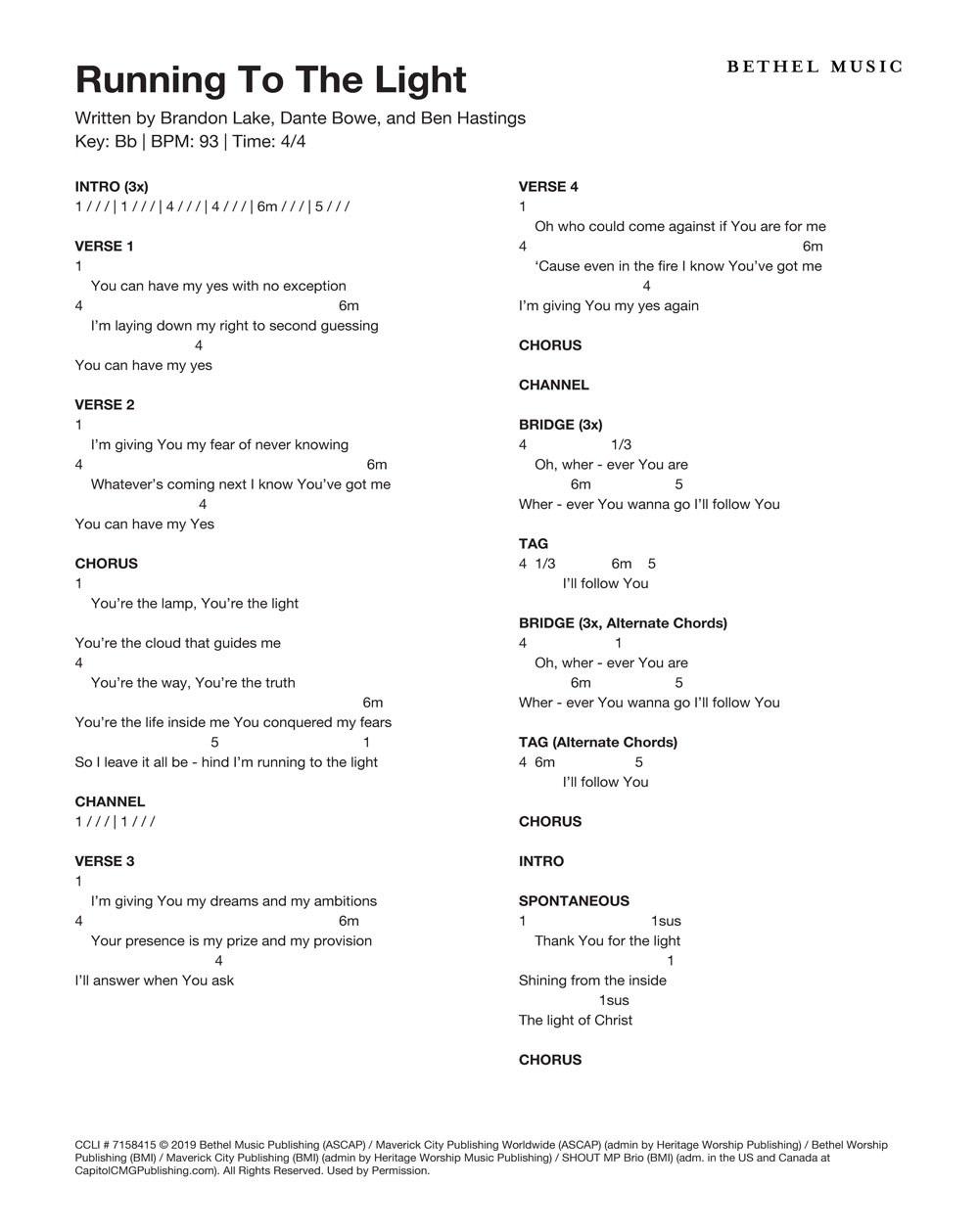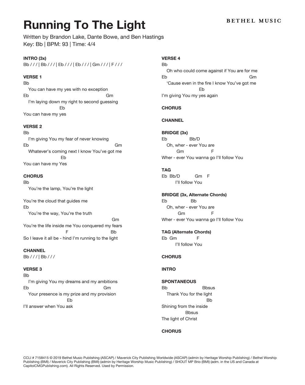 © 2019 Bethel Music Publishing (ASCAP) / Maverick City Publishing Worldwide (ASCAP) (admin by Heritage Worship Publishing) / Brandon Lake Music (ASCAP) (admin by Bethel Music Publishing) / Bethel Worship Publishing (BMI) / Maverick City Publishing (BMI) (admin by Heritage Worship Music Publishing) / SHOUT MP Brio (BMI) (adm. in the US and Canada at CapitolCMGPublishing.com). All Rights Reserved. Used by Permission.