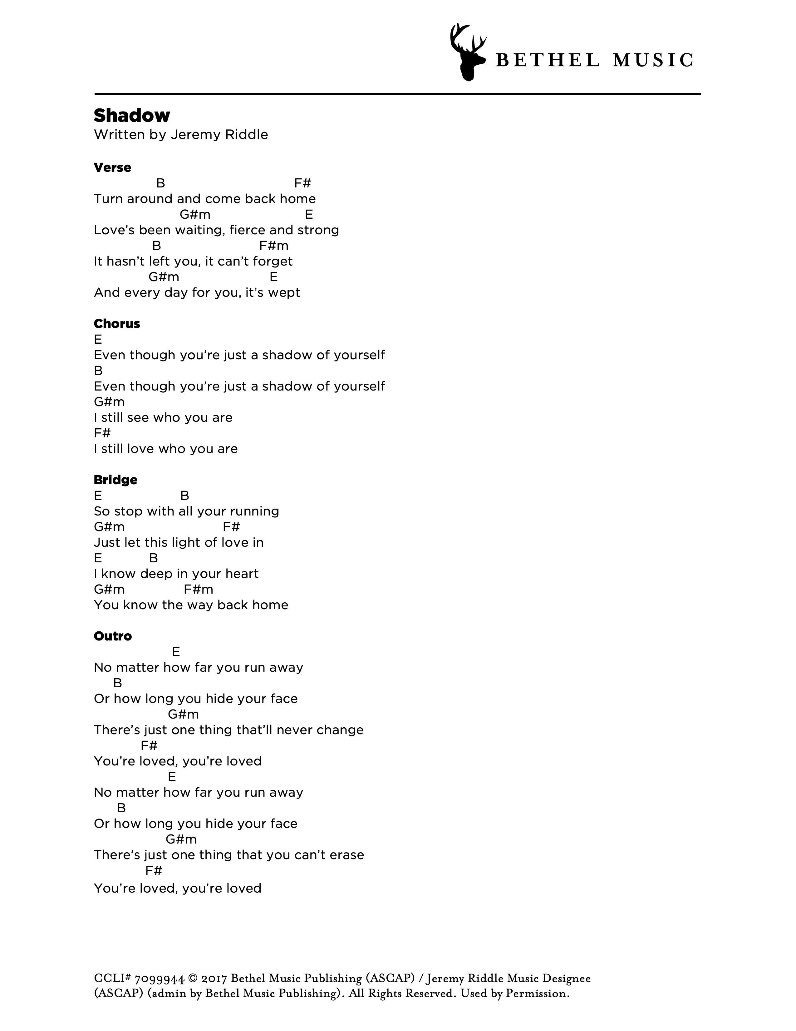 © 2017 Bethel Music Publishing (ASCAP) / Jeremy Riddle Music Designee (ASCAP) (admin by Bethel Music Publishing). All Rights Reserved. Used by Permission.