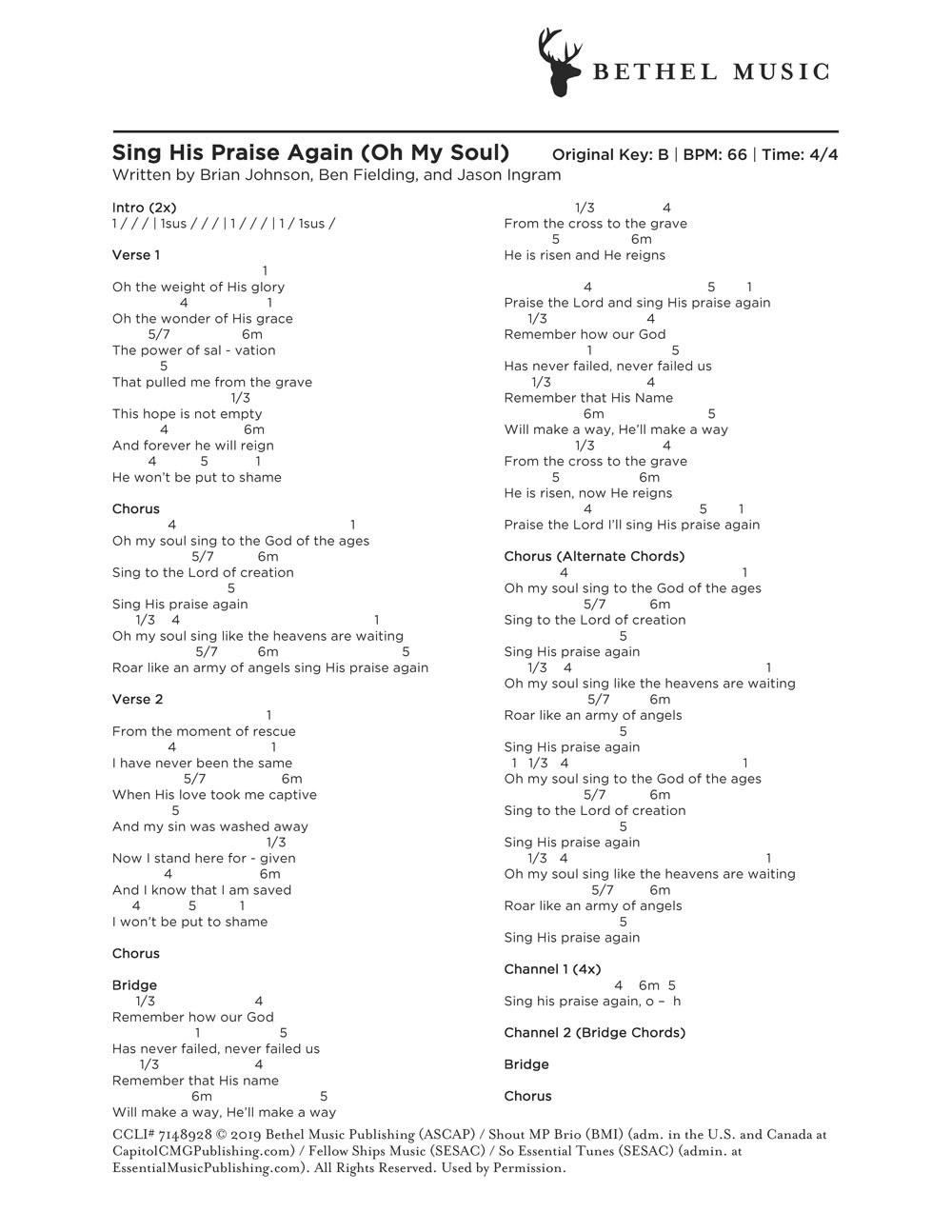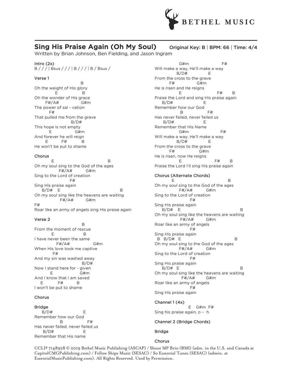 © 2019 Bethel Music Publishing (ASCAP) / Shout MP Brio (BMI) (adm. in the U.S. and Canada at CapitolCMGPublishing.com) / Fellow Ships Music (SESAC) / So Essential Tunes (SESAC) (admin. at EssentialMusicPublishing.com). All Rights Reserved. Used by Permission.