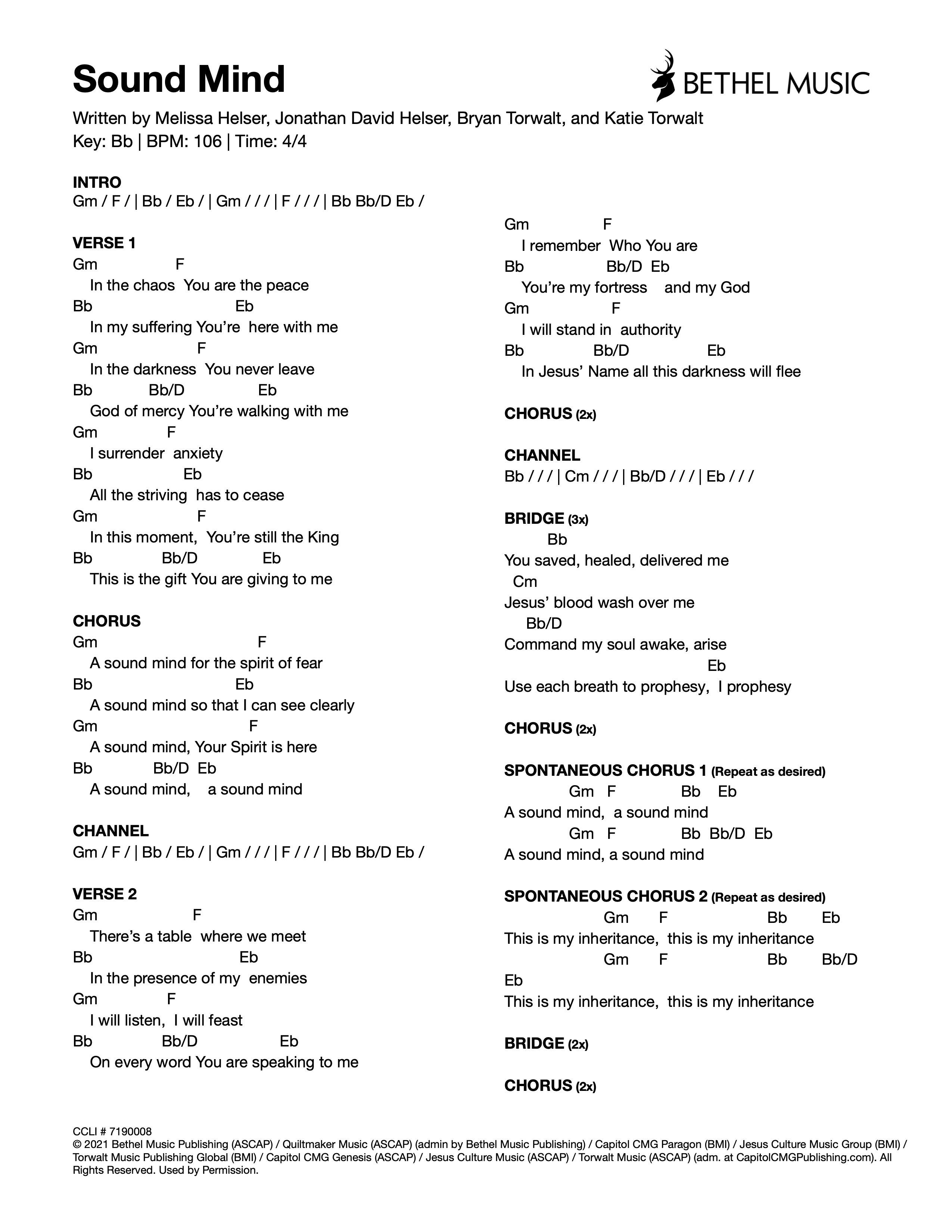 © 2021 Bethel Music Publishing (ASCAP) / Quiltmaker Music (ASCAP) (admin by Bethel Music Publishing) / Capitol CMG Paragon (BMI) / Jesus Culture Music Group (BMI) / Torwalt Music Publishing Global (BMI) / Capitol CMG Genesis (ASCAP) / Jesus Culture Music (ASCAP) / Torwalt Music (ASCAP) (adm. at CapitolCMGPublishing.com). All Rights Reserved. Used by Permission.