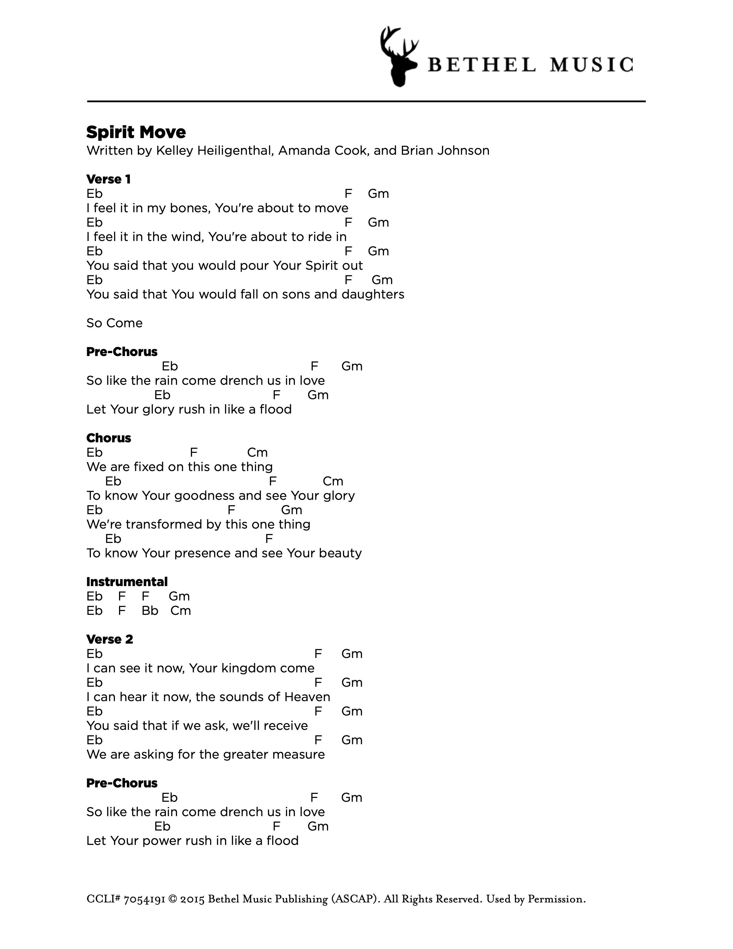 © 2015 Bethel Music Publishing (ASCAP). All Rights Reserved. Used by Permission.
