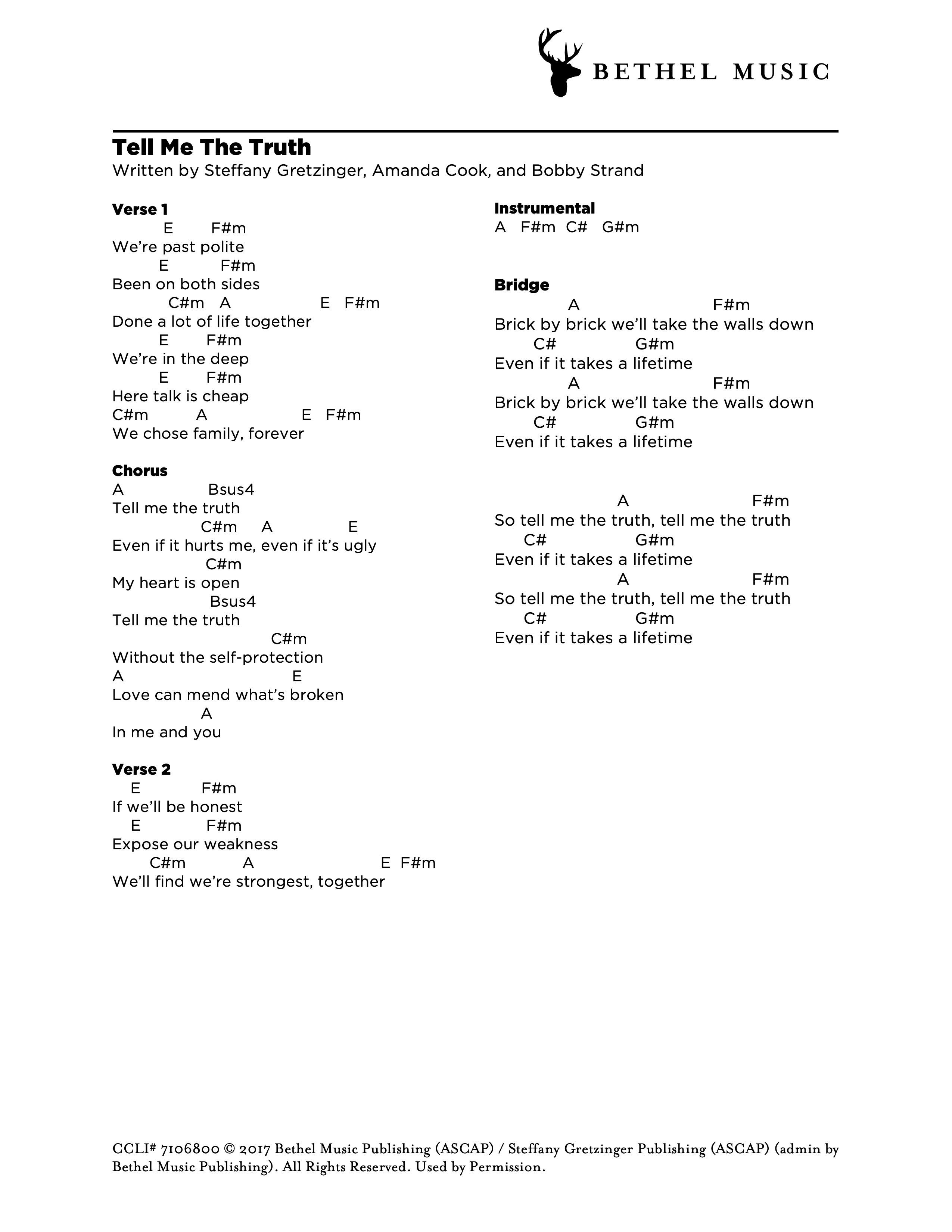 © 2017 Bethel Music Publishing (ASCAP) / Steffany Gretzinger Publishing (ASCAP) (admin by Bethel Music Publishing) / Bobby Strand Publishing (ASCAP) (admin by Bethel Music Publishing). All Rights Reserved. Used by Permission.