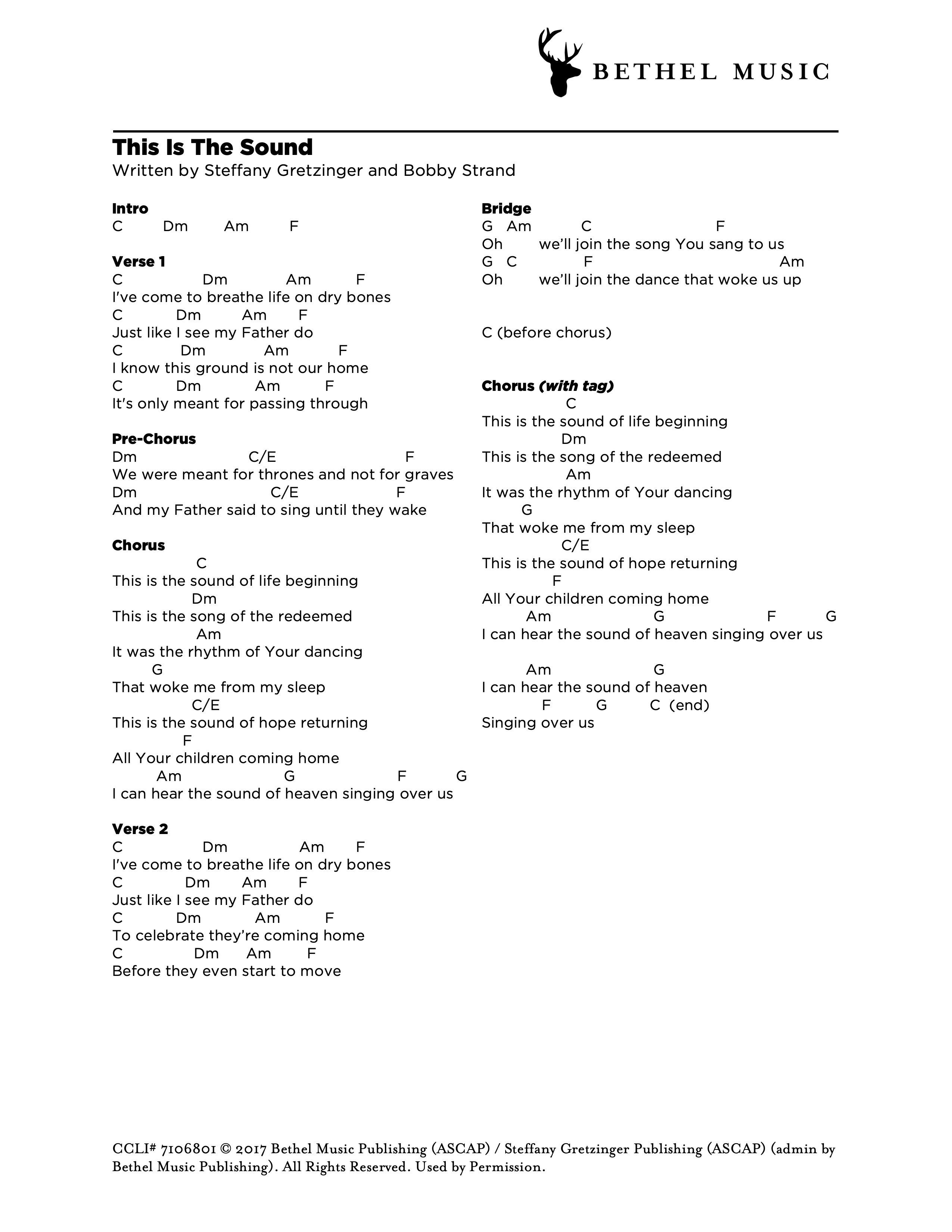 © 2017 Bethel Music Publishing (ASCAP) / Steffany Gretzinger Publishing (ASCAP) (admin by Bethel Music Publishing) / Bobby Strand Publishing (ASCAP) (admin by Bethel Music Publishing). All Rights Reserved. Used by Permission.