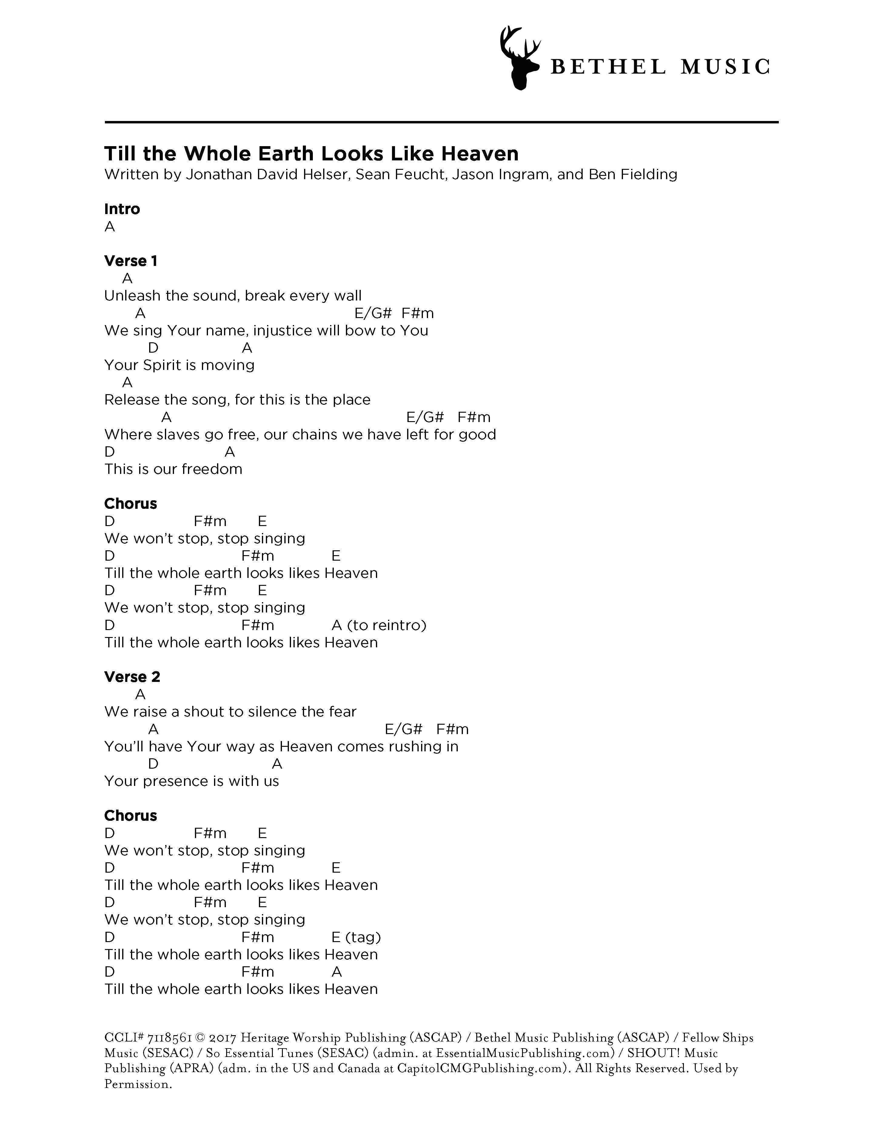 © 2017 Heritage Worship Publishing (ASCAP) / Bethel Music Publishing (ASCAP) / Fellow Ships Music (SESAC) / So Essential Tunes (SESAC) (admin. at EssentialMusicPublishing.com) / SHOUT! Music Publishing (APRA) (adm. in the US and Canada at CapitolCMGPublishing.com). All Rights Reserved. Used by Permission.