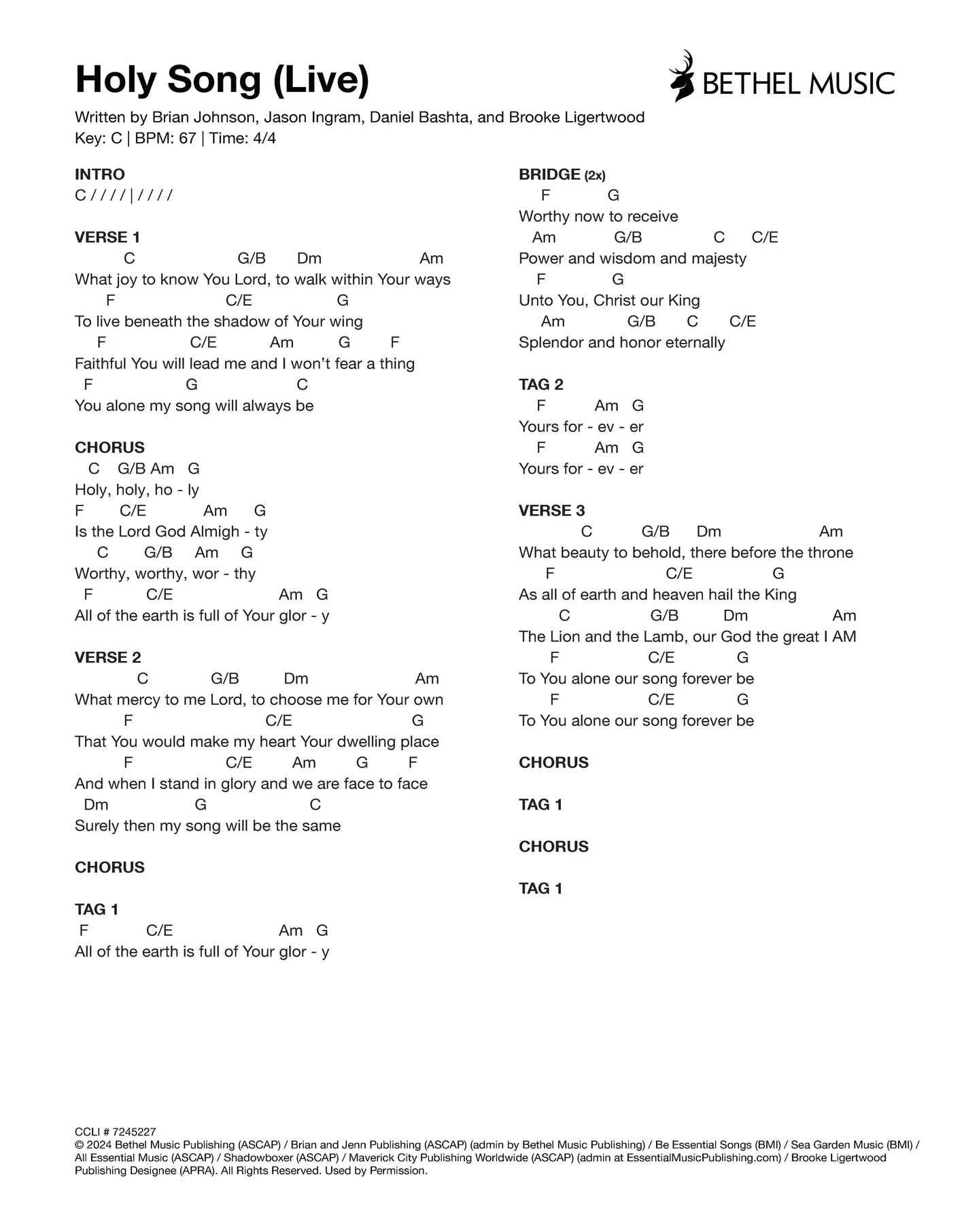 © 2024 Bethel Music Publishing (ASCAP) / Brian and Jenn Publishing (ASCAP) (admin by Bethel Music Publishing) / Be Essential Songs (BMI) / Sea Garden Music (BMI) (admin at EssentialMusicPublishing.com) / Brooke Ligertwood Publishing Designee (APRA). All Rights Reserved. Used by Permission.