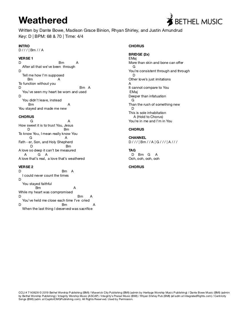 © 2019 Bethel Worship Publishing (BMI) / Maverick City Publishing (BMI) (admin by Heritage Worship Music Publishing) / Dante Bowe Music (BMI) (admin by Bethel Worship Publishing) / Integrity Worship Music (ASCAP) / Integrity’s Praise! Music (BMI) / Rhyan Shirley Pub (BMI) (all adm at IntegratedRights.com) / Centricity Songs (BMI) (adm. at CapitolCMGPublishing.com). All Rights Reserved. Used by Permission.