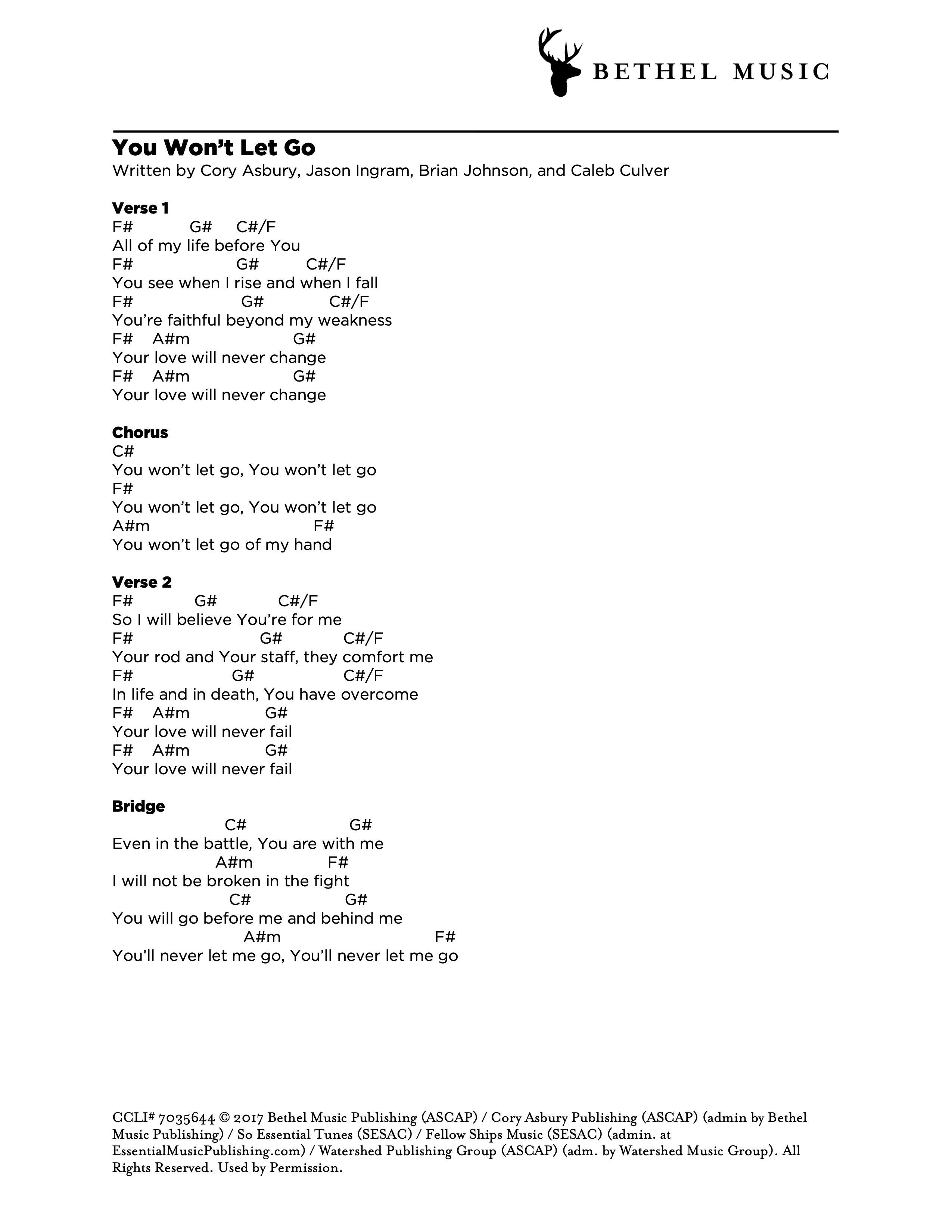 © 2017 Bethel Music Publishing (ASCAP) / Cory Asbury Publishing (ASCAP) (admin by Bethel Music Publishing) / So Essential Tunes (SESAC) / Fellow Ships Music (SESAC) (admin. at EssentialMusicPublishing.com) / Watershed Publishing Group (ASCAP) (adm. by Watershed Music Group). All Rights Reserved. Used by Permission.